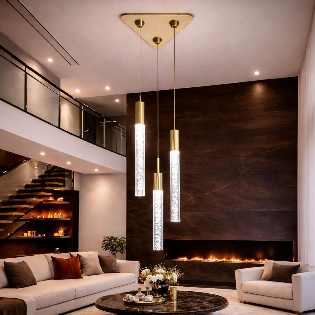 Luxus-Deckenlampe trifft auf modernen Glamour in einem markanten Mehrfach-Pendelleuchten-Design, das alltägliche Räume aufwertet. Die Luxus Kristall Bubble Pendelleuchte 3-flammig Modern Gold ist um einen klaren, dreieckigen Deckenbaldachin mit drei goldfarbenen Fassungen aufgebaut, die eine ordentliche und symmetrische Aufhängung gewährleisten. Vom Baldachin führen drei Pendelstangen herab und bilden eine dreizipfelige Anordnung, die den Blick nach oben lenkt und mühelos architektonische Balance schafft. Jede Stange ist mit schlanken vertikalen Verbindungen kombiniert, die den strukturierten Rhythmus von Pendel zu Pendel betonen. Entdecken Sie unsere Luxus-Deckenlampen-Kollektionen, in denen raffinierte Designs und sanfte Beleuchtung zusammenkommen, um moderne Innenräume mit müheloser Eleganz zu veredeln.
