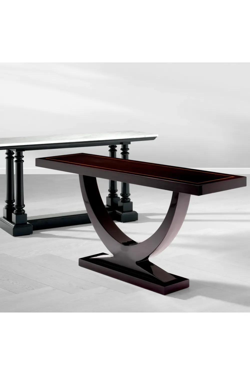 Dieser luxuriöse, dunkelbraune Konsolentisch zeigt ein poliertes, geräuchertes Eukalyptusfurnier mit eleganten Intarsien. Die glänzende Oberfläche verstärkt die Tiefe und die Lichtreflexion. Seine architektonische Silhouette bringt klassische Art-Déco-Raffinesse mit sich. Entworfen für raffinierte europäische Interieurs. Ein zeitloser, luxuriöser Konsolentisch mit Statement-Präsenz.