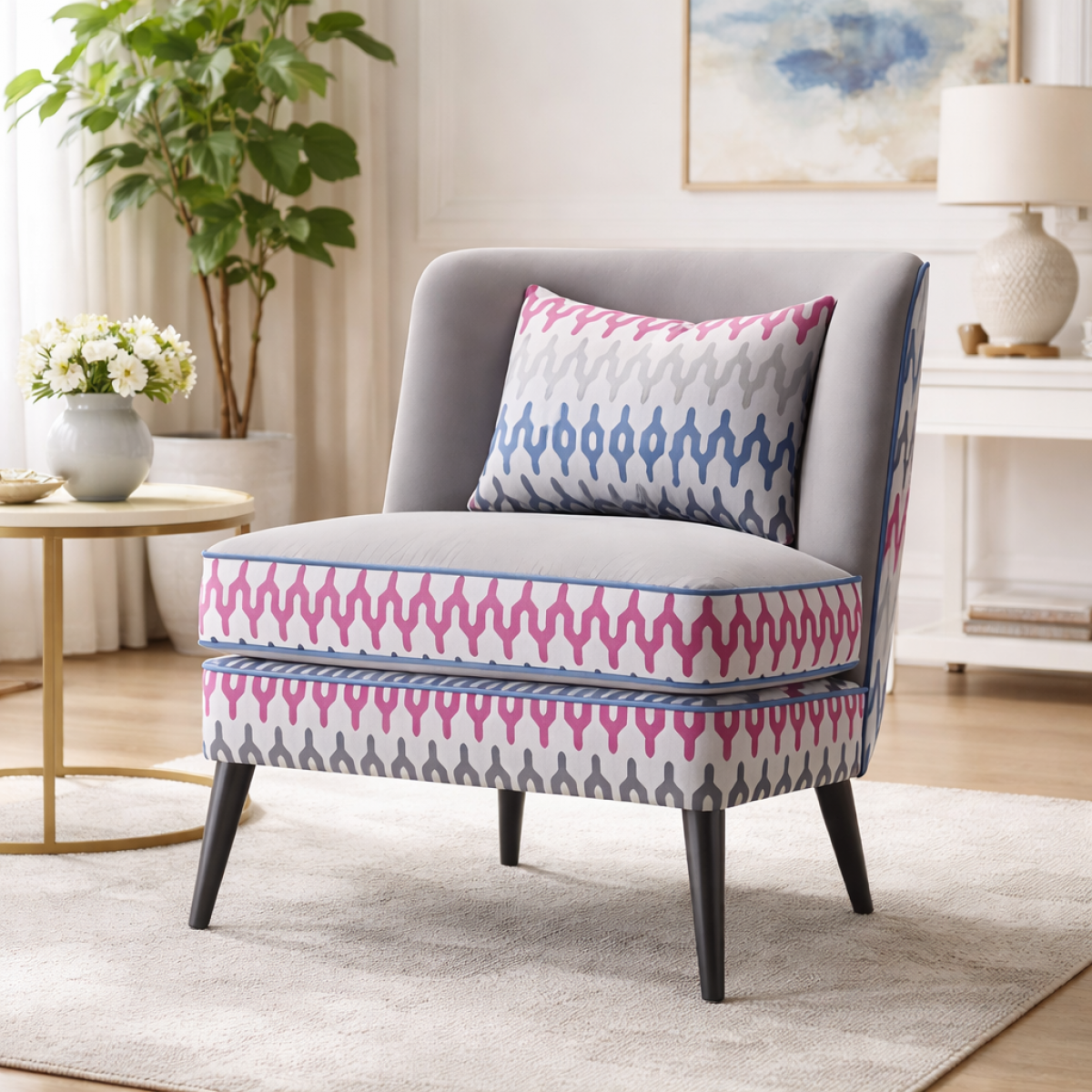 Luxuriöser Designer Polster-Akzentstuhl mit geometrischer Zierleiste und schwarzen konischen Beinen spiegelt moderne europäische Kunstfertigkeit durch Textur, Proportion und maßgeschneiderte Details wider. Dieser luxuriöse Polsterstuhl verfügt über eine sanft geschwungene Rückenlehne und einen großzügig gepolsterten Sitz, der in feinem neutralem Stoff bezogen ist. Die auffällige geometrische Zierleiste in kontrastierenden Tönen rahmt Sitz und Basis ein und verleiht Dimension und visuelles Rhythmusgefühl. Erhöht auf schlanken schwarzen konischen Beinen, verbindet dieser skulpturale Luxusstuhl dekorative Eleganz mit architektonischer Klarheit und macht ihn sowohl komfortabel als auch optisch ansprechend.
