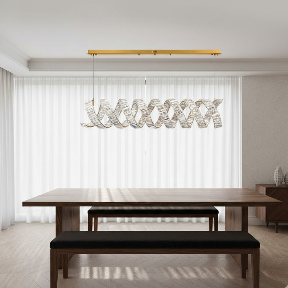 Der Luxury Double Helix Modern Linear Spiral Crystal Oval Chandelier ist ein meisterhafter Ausdruck von Geometrie und Licht. Entworfen in einer fließenden ovalen Doppelhelix-Formation, fängt jedes Kristallsegment das Licht mit außergewöhnlicher Klarheit ein und bricht es. Aufgehängt an einem minimalistischen linearen Baldachin, kombiniert dieser Spiral Crystal Chandelier präzisionsgeschliffenes Kristall mit hochwertigem Metall in Gold-, Chrom- oder Bronzeausführung. Die integrierte LED-Leiste liefert nahtlose, energieeffiziente Brillanz, die die skulpturale Form hervorhebt und gleichzeitig eine raffinierte europäische Ästhetik beibehält. Die einstellbare Höhe von 45 bis 180 cm gewährleistet eine perfekte Ausrichtung sowohl in intimen als auch in großen architektonischen Räumen.