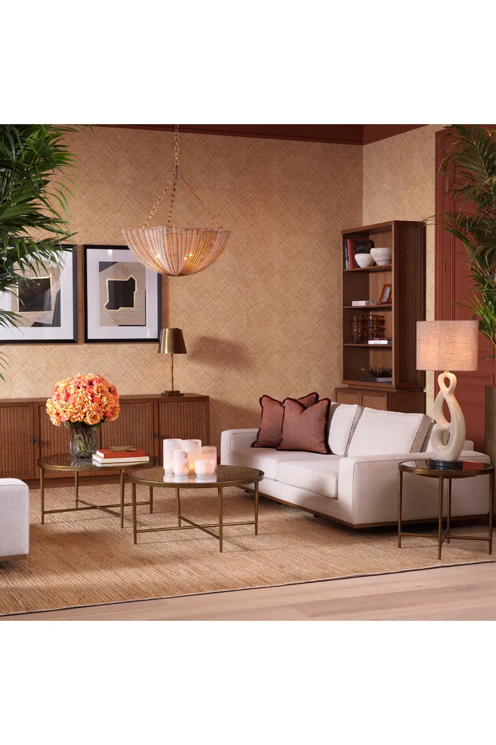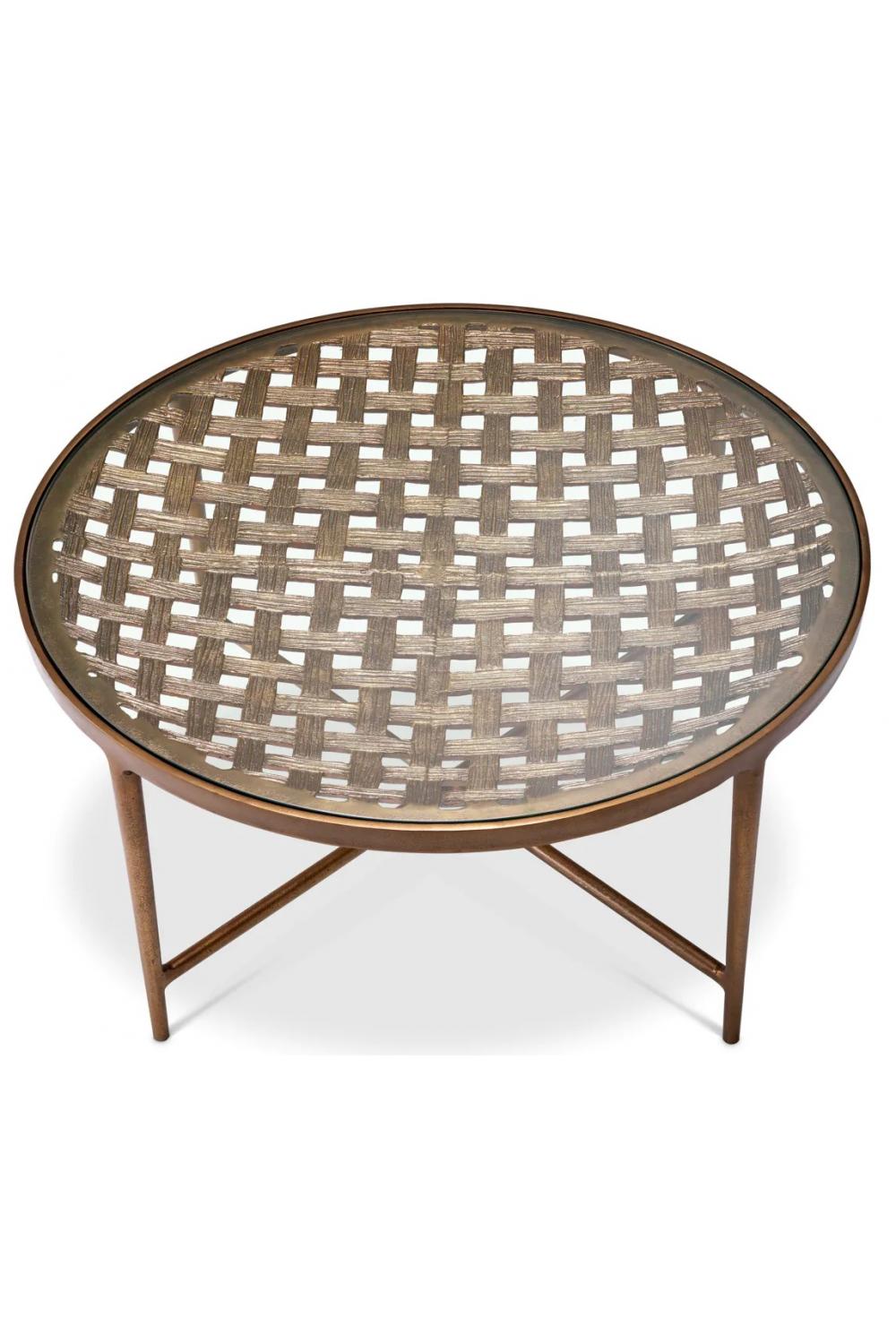 Der skulpturale Sockel zeigt ein detailliertes gewebtes Muster und bildet eine subtile schalenförmige Tischstruktur, die Tiefe und Textur verleiht. Der Couchtisch in antikem Messing verleiht dem Metallgestell Wärme und Vintage-Charakter, während die transparente Oberfläche die darunter liegende Handwerkskunst hervorhebt. Das raffinierte Design des Couchtischs mit Glasplatte lässt das Licht mühelos hindurch und unterstreicht die skulpturale Form des Tisches. Als moderner Couchtisch passt er wunderbar zu neutralen Farben, Plüschpolstern und zeitgenössischem Dekor und bildet einen raffinierten , einzigartigen Mittelpunkt im Raum.