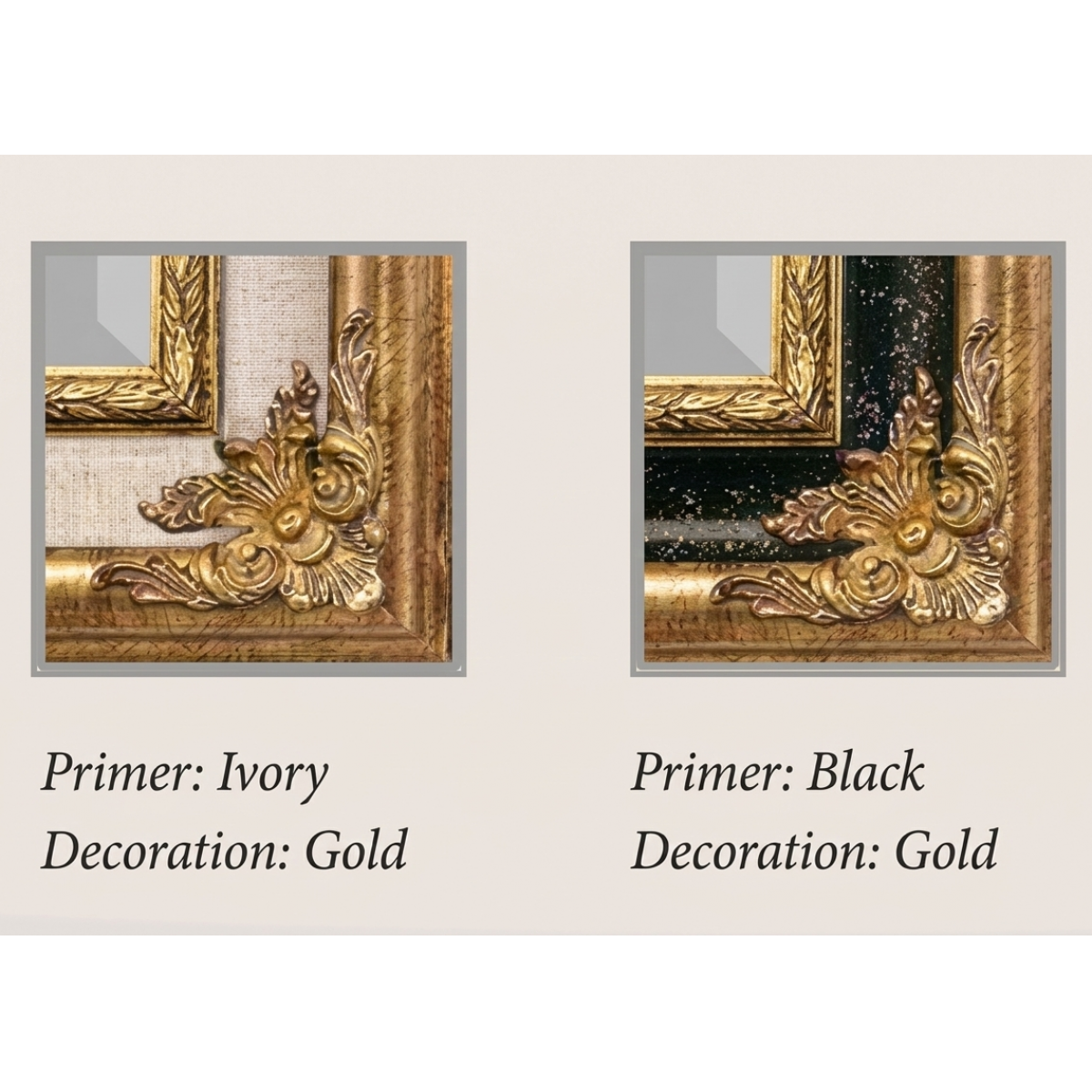 Dieser exquisite Spiegel ist auf Anfrage auch in anderen Grundierungs- und Dekorationsvarianten erhältlich, so dass Sie ihn ganz individuell auf Ihre Inneneinrichtung abstimmen können: Wählen Sie zwischen den Ausführungen Schwarz grundiert mit Golddekor für eine warme Ausstrahlung oder Elfenbein grundiert mit Golddekor für kühle Eleganz.