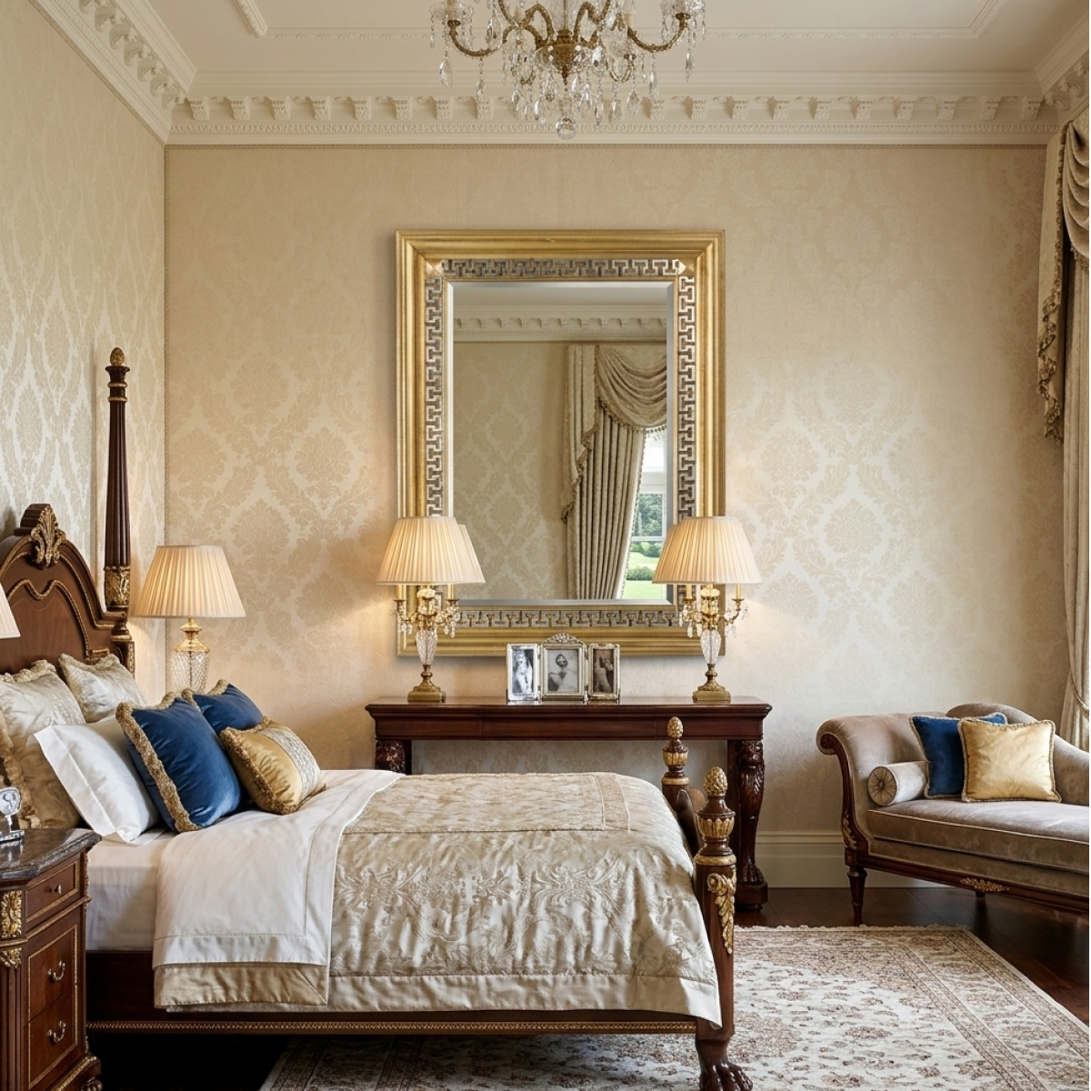 Die wahre Pracht eines großen Spiegels kommt zum Vorschein, wenn er Teil einer kuratierten Inneneinrichtung wird. Über einem stattlichen Kamin oder an einer formellen Wohnzimmerwand platziert, verstärkt dieser Spiegel sowohl das Licht als auch den Raum und dient gleichzeitig als Gesprächsgegenstand. Seine reflektierende Oberfläche wird ideal durch die substanziellen Formen luxuriöser Kommoden ergänzt, die das perfekte Grundelement darunter bilden. Das Zusammenspiel zwischen dem Goldgrund des Spiegels mit den silbernen griechischen Schlüsseldetails und den geschnitzten Fronten einer edlen Kommode schafft eine ausgewogene, galeriewürdige Präsentation, die den gesamten Raum aufwertet und Sie dazu einlädt, Ihre Inneneinrichtung mit Begleitstücken zu vervollständigen, die nach denselben anspruchsvollen Standards gefertigt wurden.