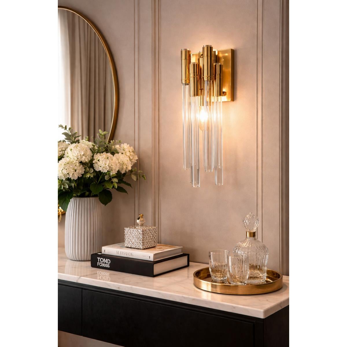 Diese luxuriöse, goldfarbene Glasstab-Wandleuchte wurde für europäische Interieurs entworfen und fügt sich nahtlos in zeitgenössische und Art-Déco-Umgebungen ein. Installieren Sie sie in symmetrischen Paaren neben Spiegeln oder Kunstwerken, um Tiefe und atmosphärische Ausstrahlung zu erzeugen. Entdecken Sie weitere raffinierte Designs in unserer luxuriösen Wandleuchten-Kollektion , um Ihr Beleuchtungskonzept zu vervollständigen.