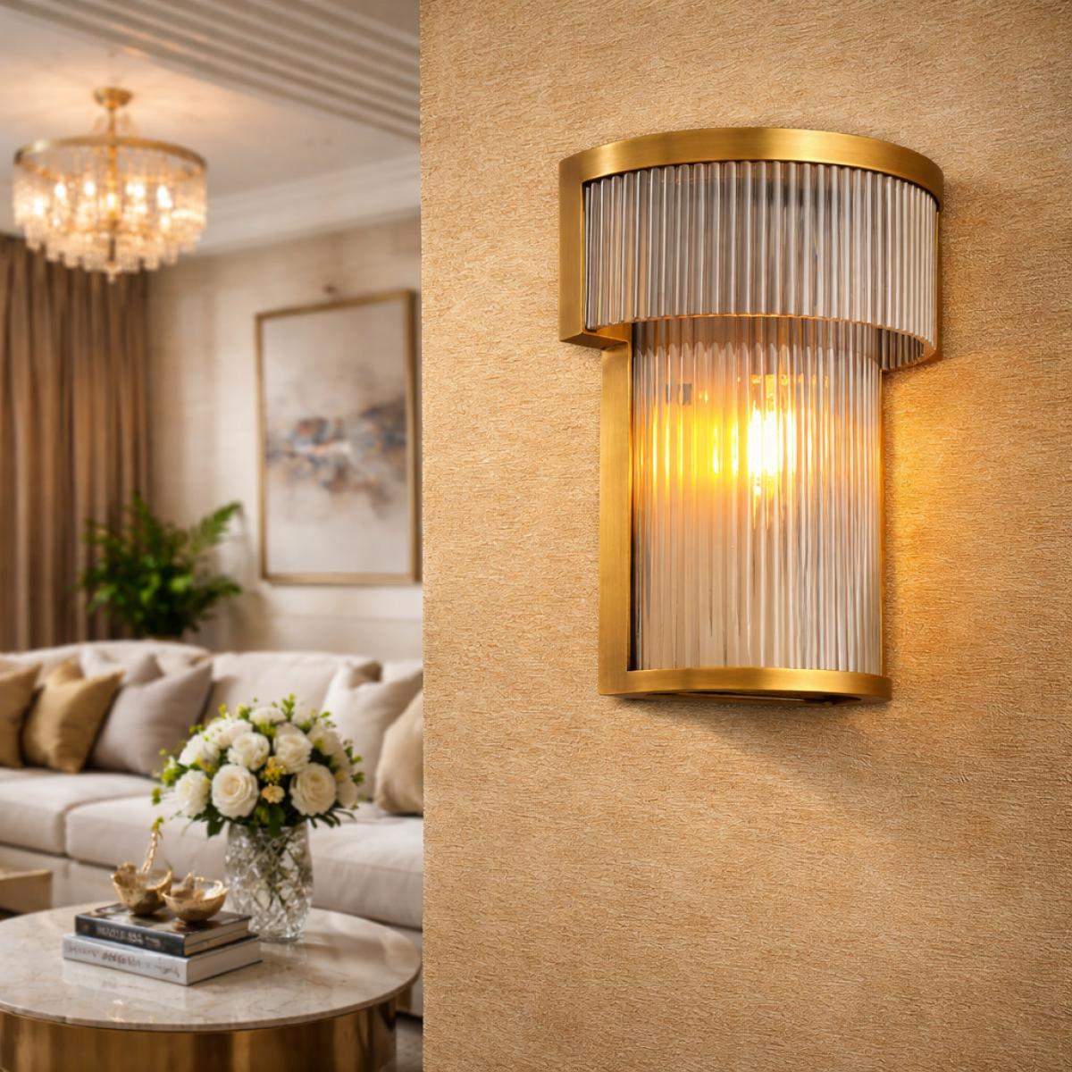 Diese Luxus-Wandleuchte wurde entworfen, um alltägliche Räume aufzuwerten. Sie kombiniert einen eleganten goldenen Rahmen mit einem vertikal geriffelten Glaszylinder, der ein warmes bernsteinfarbenes Licht nach innen abstrahlt. Die gebürstete Oberfläche in antikem Messing verleiht der Leuchte einen reichen, zeitlosen Charakter, während die geriffelte Struktur das Licht sanft bricht und formt. Als Wandlampe montiert, bringt sie eine moderne Silhouette mit klassischer Wärme – ideal für Flure, Wohnzimmer und Nachttischbereiche, in denen mehr als nur Beleuchtung gewünscht ist. Die rechteckige Montageplatte sorgt für ein klares, architektonisches Erscheinungsbild und lässt den Zylinderschirm sicher in die Wand integriert wirken.