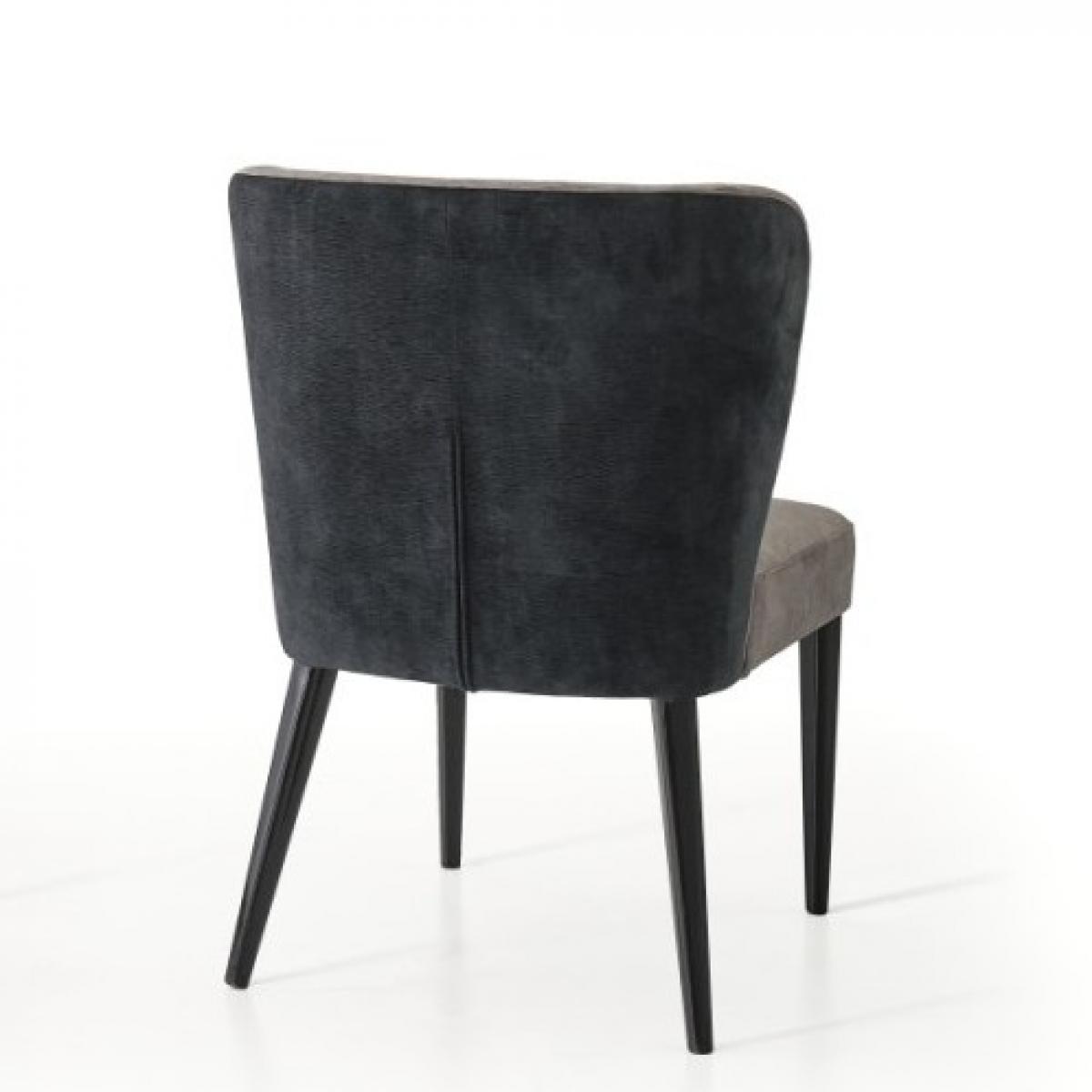 Ein raffinierter, luxuriös gepolsterter Esszimmerstuhl aus weichem grauem Samt, akzentuiert durch eine anthrazitfarbene Rückenlehne und konisch zulaufende Beine. Er wurde für elegante Interieurs entworfen und bereichert luxuriöse Stühle für Esszimmer mit moderner europäischer Raffinesse und maßgeschneidertem Komfort.