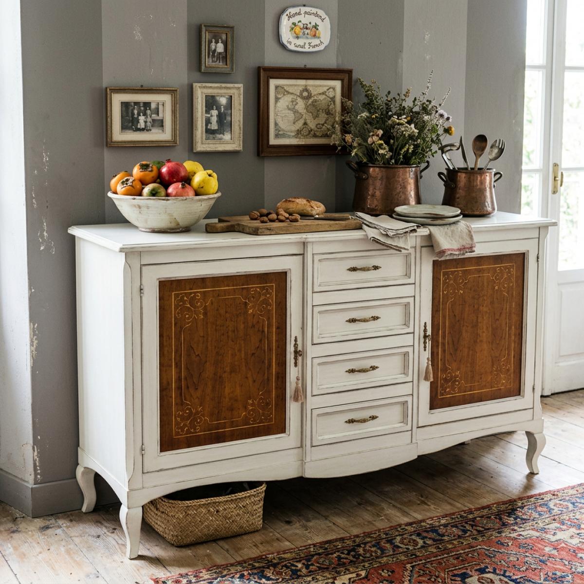 Luxuriöses Elfenbein-Barock-Sideboard mit Nussbaum-Einlegearbeiten an den Türen & Mehrfach-Schubladenaufbewahrung verkörpert raffinierte europäische Eleganz und außergewöhnliche Handwerkskunst. Dieses luxuriöse Sideboard besticht durch einen edel elfenbeinlackierten Rahmen, der durch kunstvoll gefertigte Nussbaum-Einlegearbeiten an den Türen ergänzt wird. Anmutig geschwungene Beine, dezente barocke Verzierungen und elegante Messinggriffe unterstreichen seine luxuriöse Ausstrahlung und machen es zu einem herausragenden Möbelstück für Wohnzimmer, Essbereiche oder anspruchsvolle Flure.
