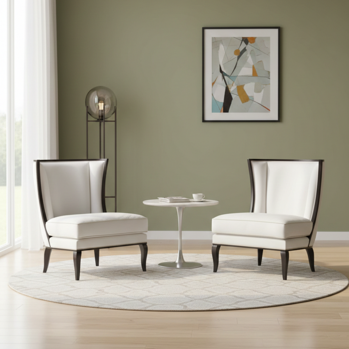 Luxury Ivory Upholstered Wingback Slipper Chair with Black Wood Trim and Cabriole Legs ist ein vornehmer, luxuriös gepolsterter Slipper Chair, der für zeitgenössische europäische Wohnräume entworfen wurde. Die skulpturale Wingback-Silhouette erhebt sich anmutig und schafft ein architektonisches Profil, während die schlanke, armlose Slipper-Form beibehalten wird. Der Stuhl ist mit einem raffinierten elfenbeinfarbenen Stoff gepolstert und wird durch eine kühne schwarze Holzverzierung akzentuiert, die den Rahmen mit eleganter Präzision umreißt. Ein großzügig gepolsterter Sitz bietet strukturierte Unterstützung, während die sanft geschwungenen Cabriole-Beine klassische Raffinesse einführen. Diese Komposition platziert das Design selbstbewusst innerhalb der kuratierten Kollektionen luxuriöser Wingback-Stühle.