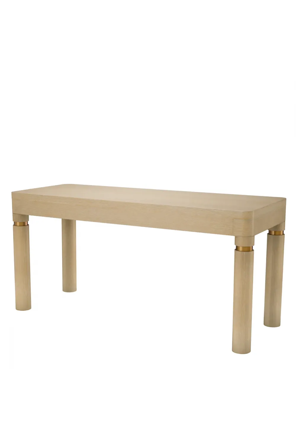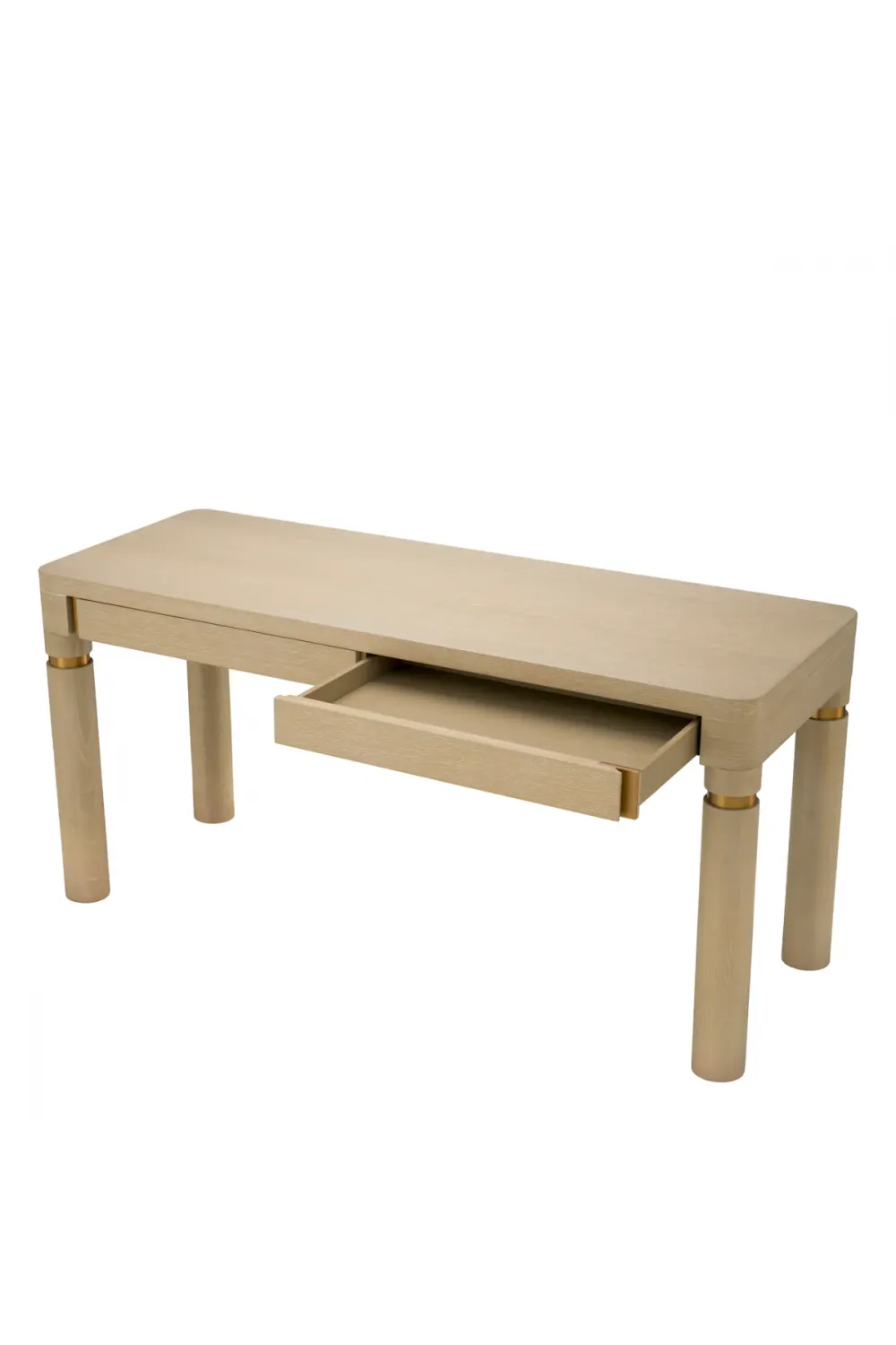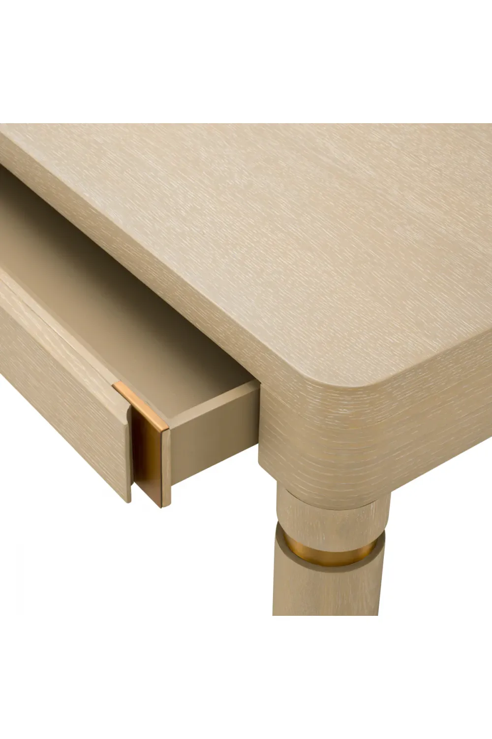 Veredeln Sie Ihren Arbeitsplatz mit diesem luxuriösen Schreibtisch aus Mocha-Eichenfurnier, akzentuiert mit einem gebürsteten Messing-Finish. Ein anspruchsvoller Schreibtisch, der moderne Eleganz, Funktionalität und zeitloses Design für gehobene Innenräume vereint.