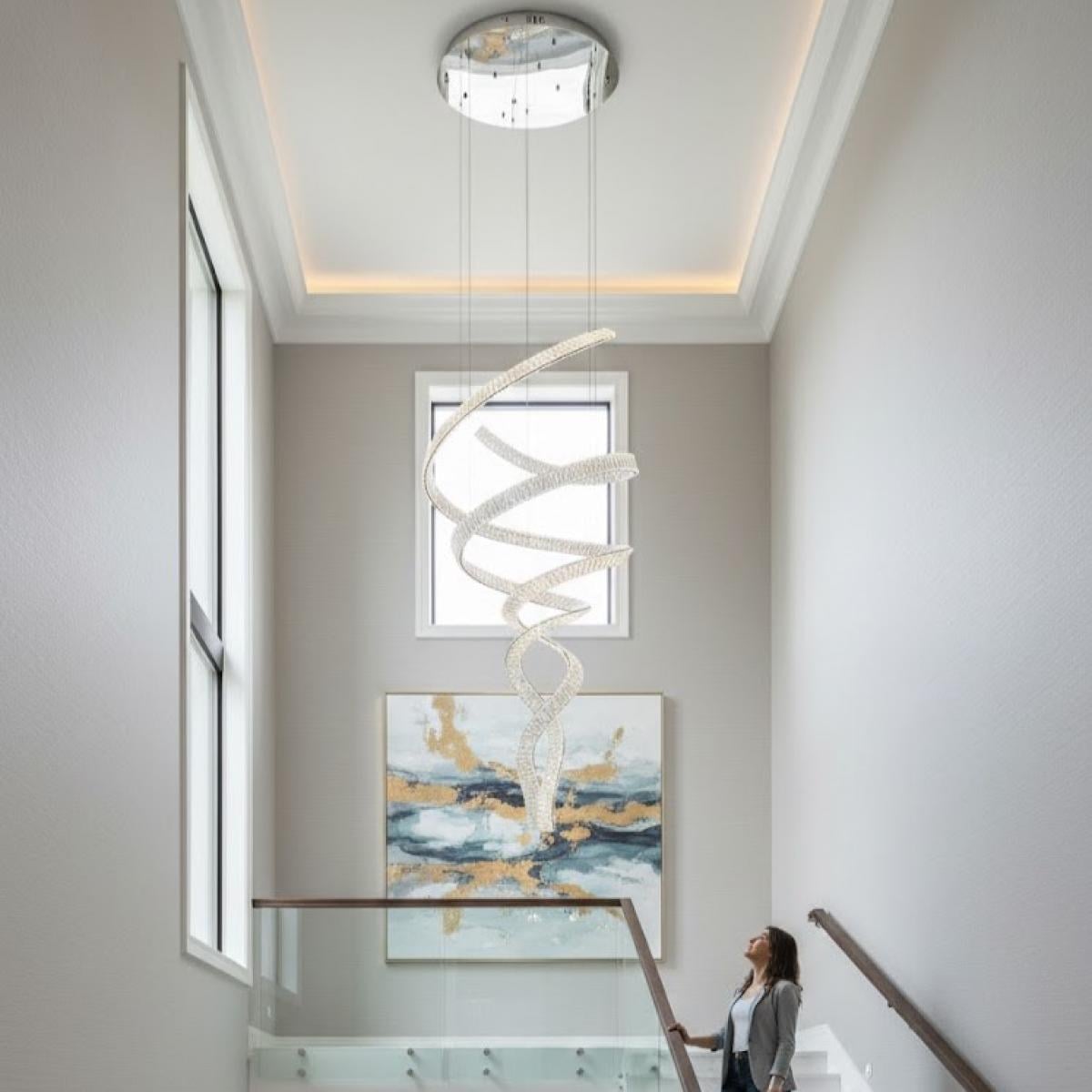 Das Zusammenspiel von spiralförmiger Geometrie und kristalliner Brillanz schafft eine visuelle Reise nach oben, die die Aufmerksamkeit auf die Deckenhöhe und die räumliche Größe lenkt. Mit energieeffizienter LED-Technologie und schimmernden Kristalldetails bietet dieser Kronleuchter sowohl Innovation als auch Kunstfertigkeit.