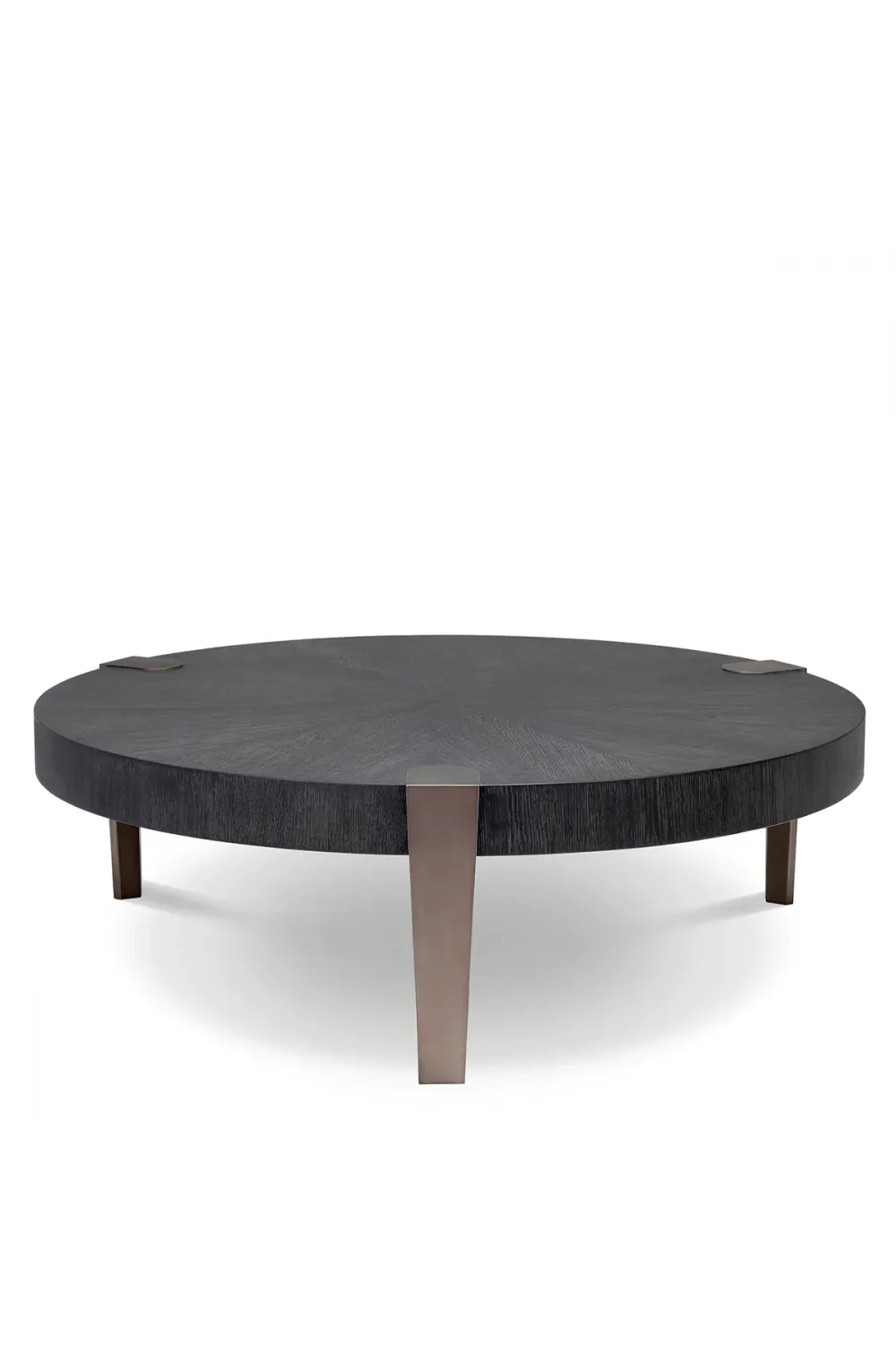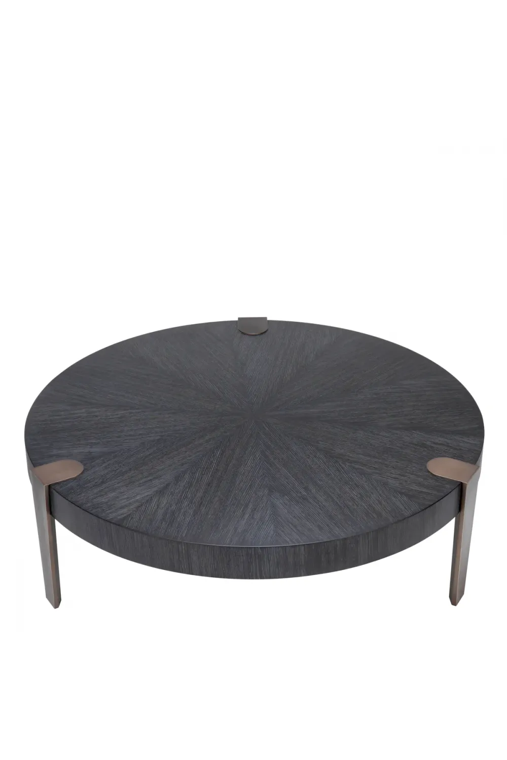 Mit diesem luxuriösen Couchtisch mit runder Platte aus Eichenfurnier und skulpturalen Metallbeinen in gebürstetem Messing oder Bronze setzen Sie einen modernen und zeitlosen Akzent für raffinierte Wohnräume.