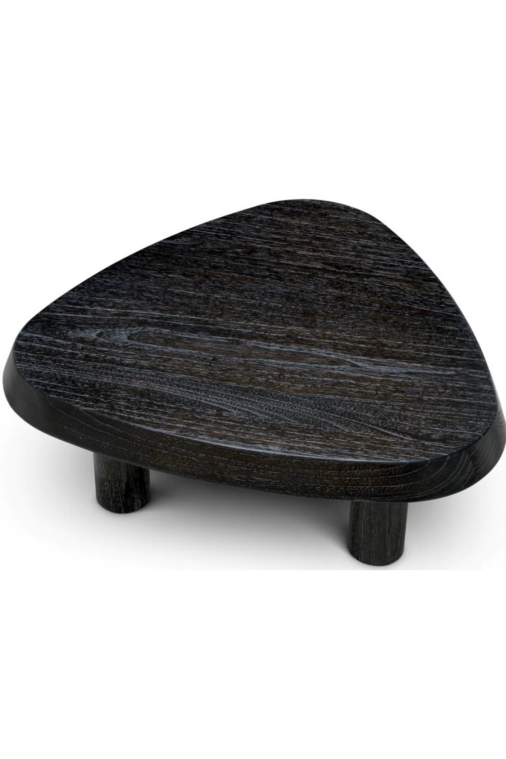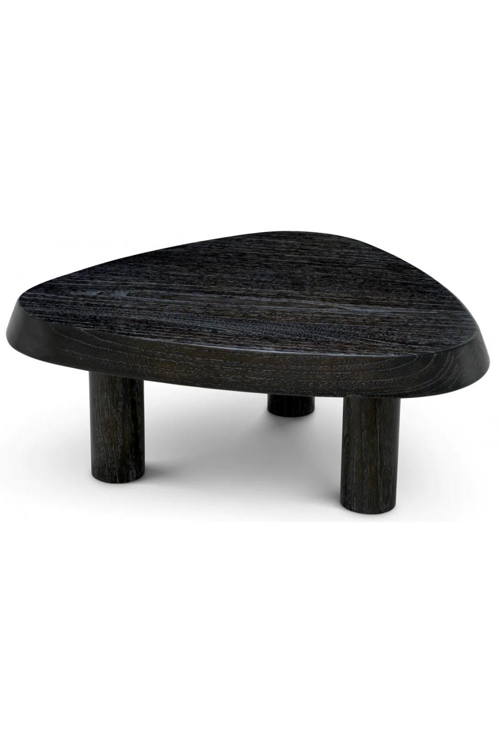 Als hochwertiger Holzkaffeetisch entworfen, verfügt das Stück über eine dicke, kieselförmige Tischplatte, die sowohl Stärke als auch eine skulpturale Präsenz bietet. Gestützt von drei stabilen Beinen gewährleistet der Tisch Stabilität und behält dabei ein optisch leichtes und elegantes Profil bei. Seine verfeinerten Proportionen positionieren ihn als markanten Design-Kaffeetisch, ideal für kuratierte Innenräume. Die Eichenfurnier-Oberfläche ermöglicht es, ihn als moderne schwarze Alternative zum Kaffeetisch in neutralen Farbschemata einzusetzen und gleichzeitig die Wärme von natürlichem Holz klar zu repräsentieren. Diese Handwerkskunst definiert ihn als echten luxuriösen modernen Kaffeetisch.