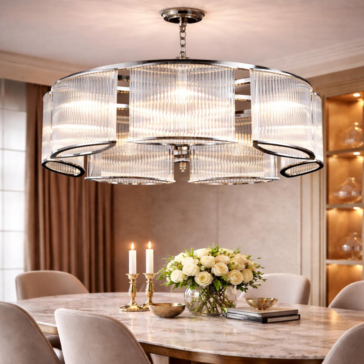 Der Titel spiegelt seine definierende Identität wider. „Luxuriös“ signalisiert erstklassige Handwerkskunst und hochwertige Materialien. „Polierter Chrom“ hebt die spiegelähnliche Metalloberfläche hervor, die zeitgenössische Innenräume ergänzt. „Art Deco gerippter Glas-Trommel-Kronleuchter“ fängt seine strukturierte Geometrie ein, inspiriert von den Designprinzipien der 1920er Jahre und zugleich moderner Minimalismus. Als ausgezeichneter Art Deco Glas-Kronleuchter fügt er sich nahtlos in Modern Luxury, Contemporary Classic und Transitional European Umgebungen ein. Dieser raffinierte polierte Chrom Trommel-Kronleuchter ist ideal über Esstischen, markanten Couchtischen, Hauptschlafzimmern und Executive-Büros, wo eine stimmungsvolle Eleganz unerlässlich ist.