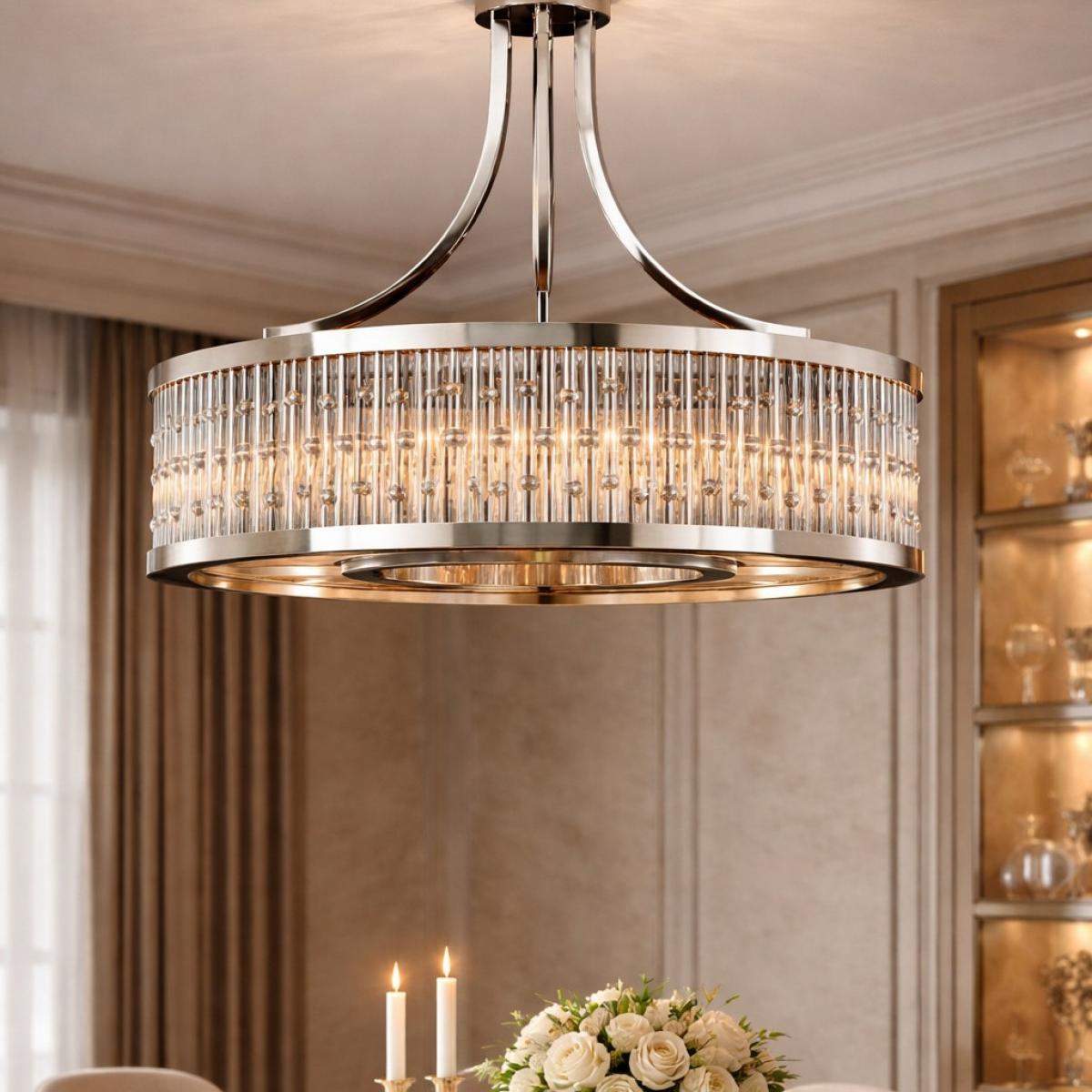 Der Titel spiegelt seine definierenden Elemente wider: „Luxuriös“ hebt die überlegene Handwerkskunst und hochwertige Materialien hervor; „Polierter Nickel“ verweist auf das elegante metallische Finish; „Art Deco Trommel Kristall Kronleuchter“ fängt seine strukturierte zylindrische Geometrie ein, inspiriert von den Designprinzipien der 1920er Jahre; und „Perlenstab-Design“ betont die filigranen Kristalldetails, die die visuelle Tiefe erhöhen. Als ein ausgezeichneter Art Deco Kristall Kronleuchter ergänzt er moderne Luxus-, Übergangs-Europäische und zeitgenössisch klassische Innenräume. Dieser elegante polierte Nickel Kronleuchter wirkt wunderschön über Esstischen, in großen Foyers, Hauptschlafzimmern oder Chef-Büros.