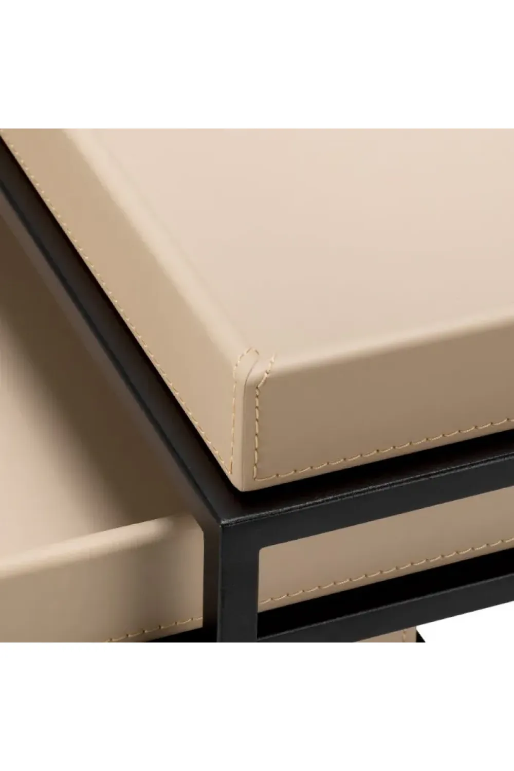 Rechteckiger Nachttisch mit 3 Schubladen (schwarz & hellbraun), definiert durch einen eleganten, mattschwarzen Metallrahmen und hellbraune Kunstlederoberflächen. Seine strukturierte, rechteckige Form bringt architektonische Klarheit in moderne Interieurs. Das raffinierte Kunstleder-Finish sorgt für Wärme und taktile Raffinesse. Als verschachteltes Trio konzipiert, ermöglicht es eine flexible Platzierung und ein mehrschichtiges Styling. Dieser luxuriöse Beistelltisch funktioniert wunderbar als rechteckiger Beistelltisch für moderne Interieurs.