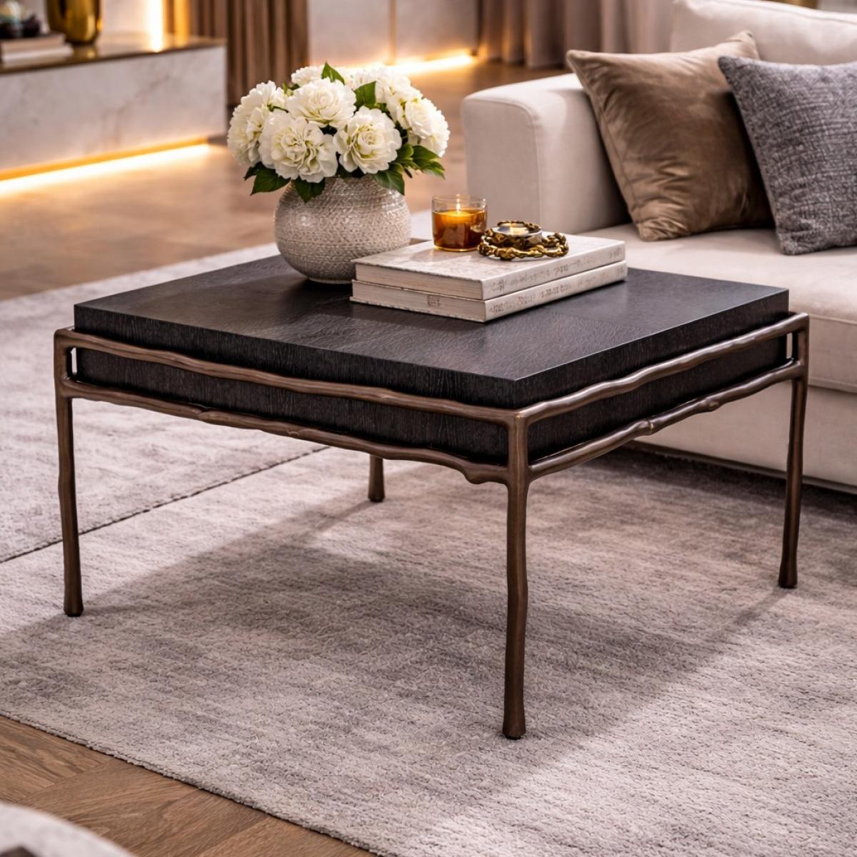 Der Luxuriöse Rechteckige Beistelltisch mit Kohlegrauem Eichenfurnier und Mittelbronze-Finish ist eine raffinierte Balance aus Textur und skulpturaler Form. Entworfen mit einer reich getönten Tischplatte aus kohlegrauem Eichenfurnier, offenbart dieses Statement-Stück eine subtile Holzmaserung, die seinen architektonischen Charakter unterstreicht. Der Rahmen mit Mittelbronze-Finish bringt Wärme und metallische Raffinesse ins Spiel, während vier organisch geformte Beine eine fließende Silhouette schaffen, die sowohl künstlerisch als auch stabil wirkt. Mit den Maßen 65 cm mal 65 cm und einer Höhe von 38,5 cm bietet dieser luxuriöse rechteckige Beistelltisch mit kohlegrauem Eichenfurnier und Mittelbronze-Finish großzügigen Platz auf der Oberfläche und bewahrt dabei ein schlankes, zeitgemäßes Profil.