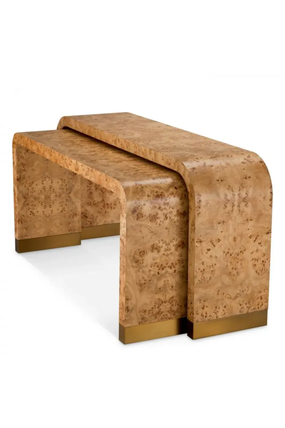 Luxury Rectangular Light Brown Mappa Burl Console Table ist ein Statement für raffinierte Handwerkskunst und architektonische Ausgewogenheit. Dieser rechteckige hellbraune Konsolentisch ist sorgfältig mit hellbraunem Mappa Burl-Furnier verarbeitet, das für seine natürlich ausdrucksstarke Maserung bekannt ist. Zusammen mit einem skulpturalen Sockel in Antikmessing-Finish bietet das verschachtelte Konsolenset visuelle Tiefe, Proportionen und dauerhaften Luxus für kuratierte Wohnräume.