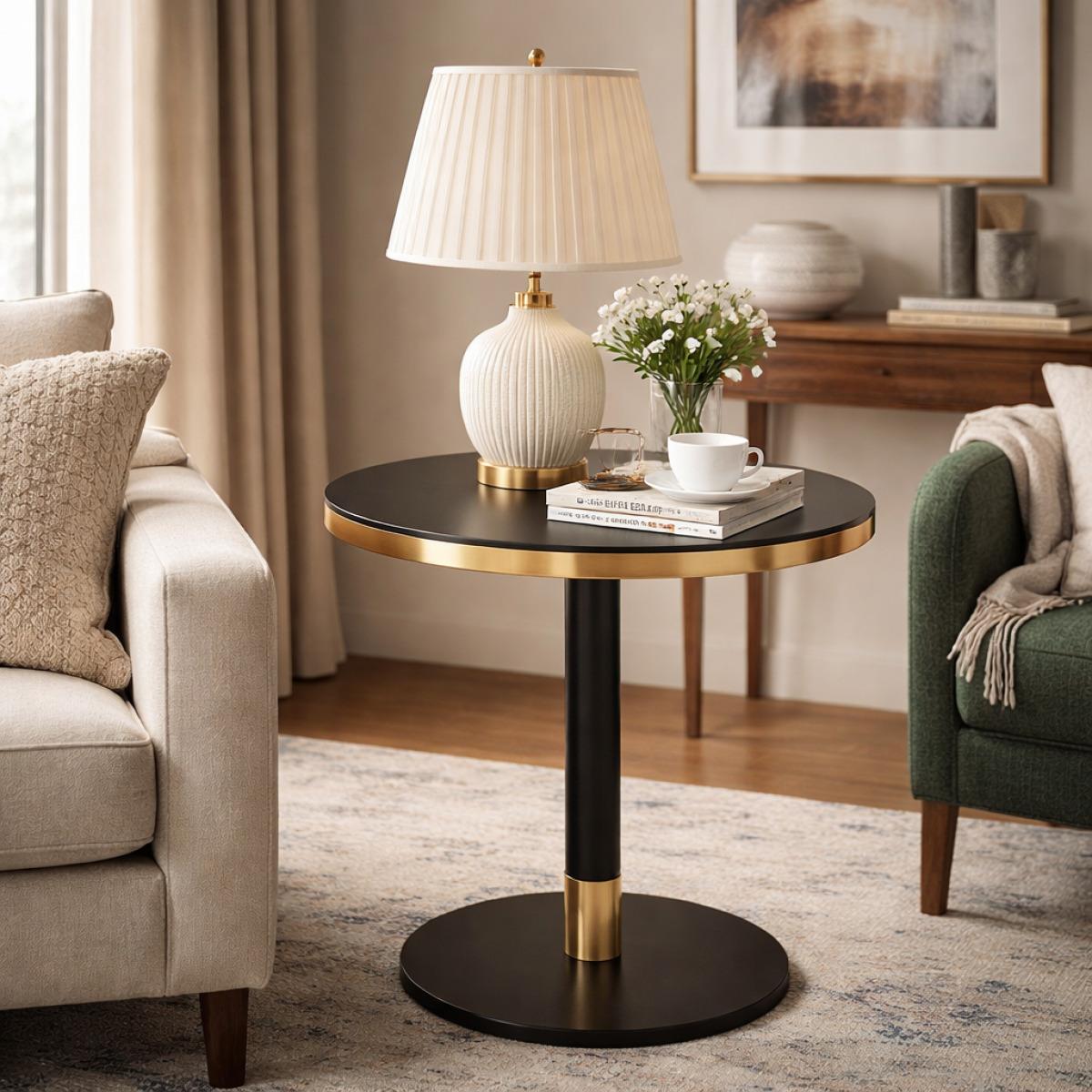 Innerhalb kuratierter Kollektionen von designorientierten runden Tischen sticht dieses Stück durch seine skulpturale Klarheit und feine metallische Akzente hervor. Das Zusammenspiel von mattschwarzen Oberflächen und leuchtenden goldenen Details verstärkt seine Attraktivität als eines der elegantesten luxuriösen Beistelltische für das Wohnzimmer. Für ein abgestimmtes Innenraumkonzept kombinieren Sie es mit dem Runden Bartisch mit Marmorplatte auf schwarzer Dreibeinbasis, um die raffinierte Schwarz-Gold-Ästhetik in gehobenen Entertainment-Bereichen widerzuspiegeln.