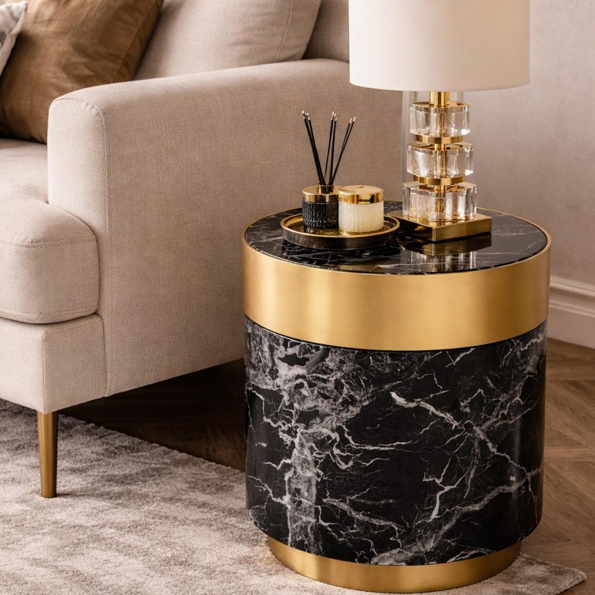 Luxuriöser runder Beistelltisch mit schwarzer Marmor-Optik und Messingrand von Luxury Group International