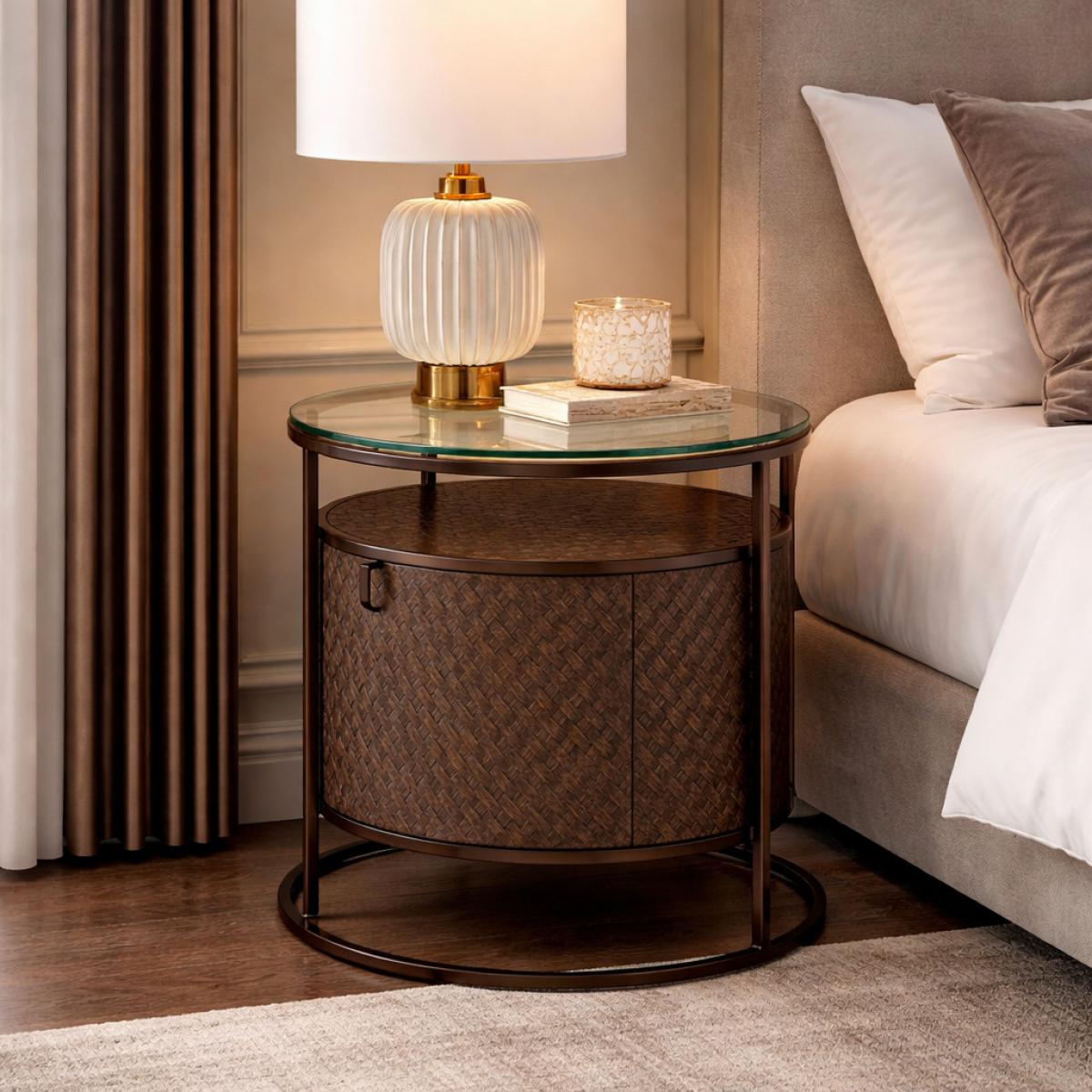 Der luxuriöse Nachttisch aus Eichenfurnier mit Bronze-Finish und klarem Glas verkörpert verfeinerte europäische Handwerkskunst mit seinem geflochtenen Eichenfurnier-Korpus, dem architektonisch bronze-farbenen Rahmen und der eleganten klaren Glasplatte. Die runde Silhouette schafft visuelle Harmonie, während das strukturierte Furnier Tiefe und handwerklichen Charakter verleiht. Ausgestattet mit einer zum Ziehen geöffneten Soft-Close-Schublade bietet dieser luxuriöse Nachttisch aus Eichenfurnier mit Bronze-Finish und klarem Glas diskreten Stauraum, ohne die schlanke Ästhetik zu stören. Perfekt ausgewogen in den Proportionen (Ø 50 x H. 56 cm) vereint er Funktionalität und skulpturale Präsenz.