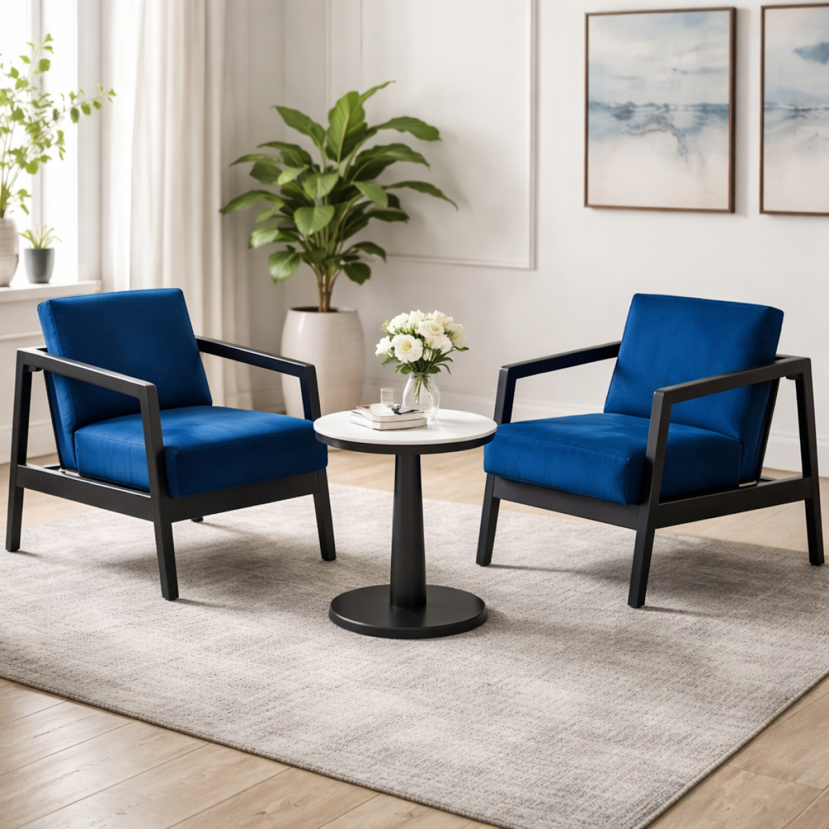 Luxuriöser Sessel mit königsblauem Samtbezug und schwarzem architektonischem Holzrahmen verkörpert zeitgenössische europäische Raffinesse durch kühne Struktur und weiche Textur. Dieser luxuriöse Polstersessel verfügt über einen tief königsblauen Samtsitz und eine Rückenlehne, die von einem markanten geometrischen schwarzen Holzrahmen getragen werden. Das klare architektonische Armlehnen-Design fördert Offenheit, während die sanft geneigte Rückenlehne und der großzügig gepolsterte Sitz ausgewogenen Komfort gewährleisten. Als ein herausragender luxuriöser Samtsessel bringt er sowohl künstlerische Präsenz als auch funktionale Eleganz in anspruchsvolle Innenräume.