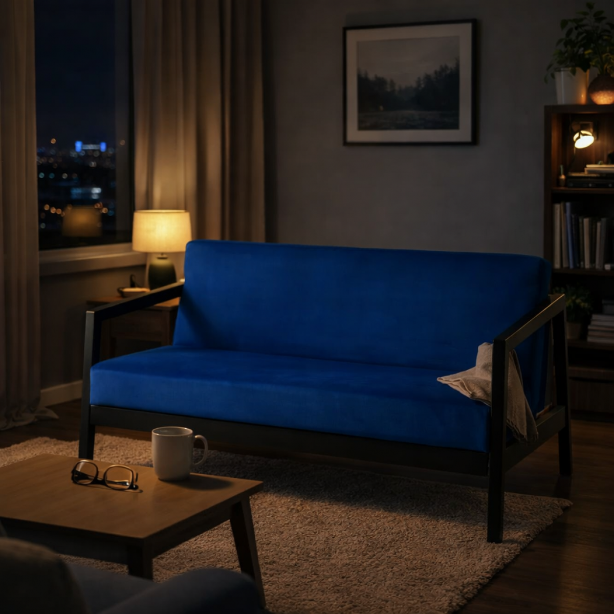 Das Luxury Royal Blue Velvet Upholstered Sofa with Black Linear Wood Frame - 2 Seater ist ein markanter Ausdruck moderner europäischer Handwerkskunst. Umhüllt von tiefem königsblauem Samt, bringt dieses luxuriöse Polstersofa Tiefe, Textur und dezente Opulenz in raffinierte Wohnumgebungen. Die klaren, ununterbrochenen Linien des schwarzen linearen Holzrahmens schaffen ein scharfes architektonisches Profil, das dem Stück einen zeitgenössischen Rand verleiht und gleichzeitig zeitlose Raffinesse bewahrt.