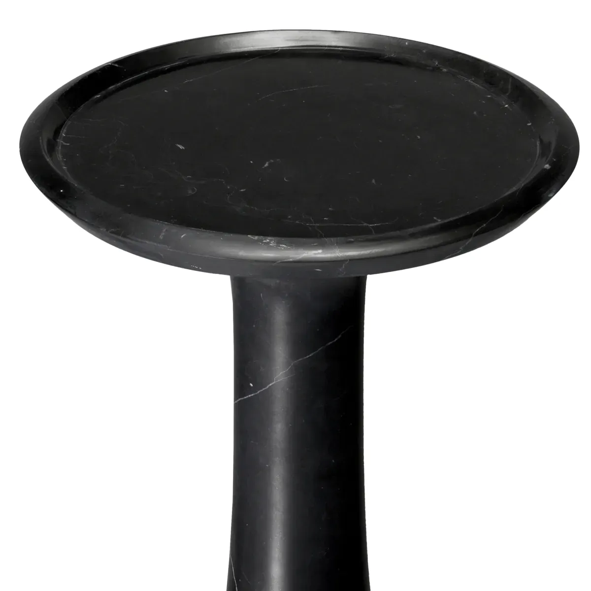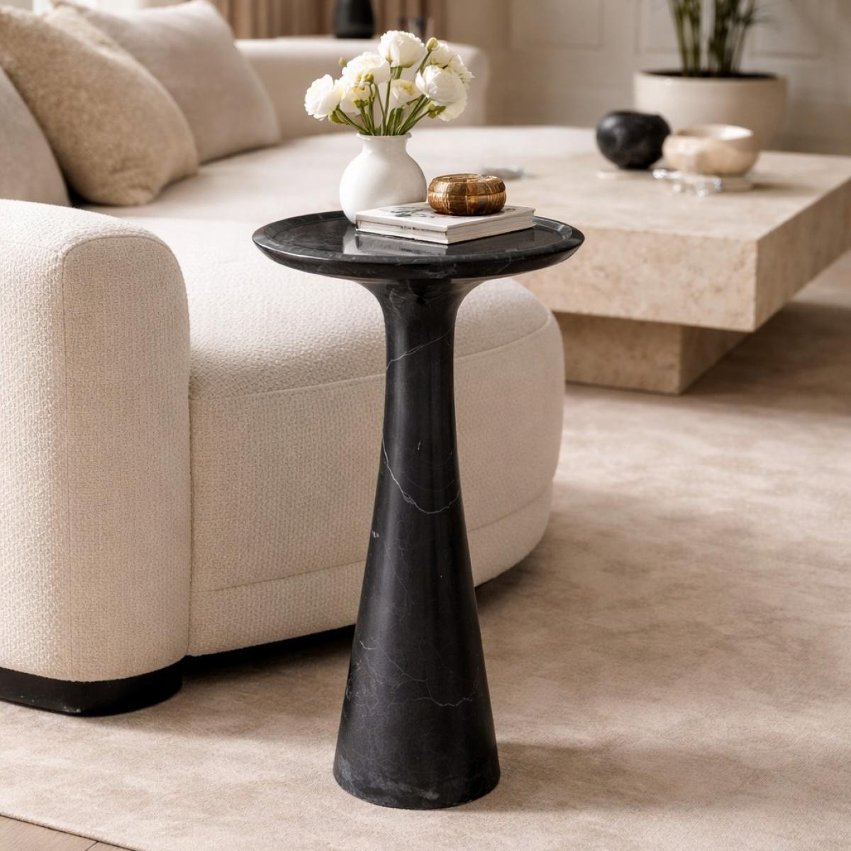 Der Luxuriöse Skulpturale Sockel Beistelltisch aus Schwarzem Marmor für das Wohnzimmer ist ein raffiniertes architektonisches Highlight, das anspruchsvolle Innenräume aufwertet. Fachmännisch aus massivem, geschliffenem italienischem Marmor gefertigt, verkörpert dieser Luxuriöse runde Beistelltisch mit schwarzer Marmorplatte skulpturale Eleganz durch seine schlanke Sockelform und ausgewogene Proportionen. Die runde Tischplatte verfügt über eine dezente erhöhte Kante, die sowohl die Praktikabilität als auch die visuelle Raffinesse erhöht. Die geschliffene Oberfläche mildert den tiefschwarzen Ton des Marmors und lässt die natürliche Maserung elegant hervortreten, wodurch jedes Stück einzigartig bleibt. Sein hoher, ausgestellter Sockel schafft ein fließendes vertikales Profil, inspiriert vom modernistischen Design der Siebzigerjahre und neu interpretiert für zeitgenössische europäische Wohnzimmer.