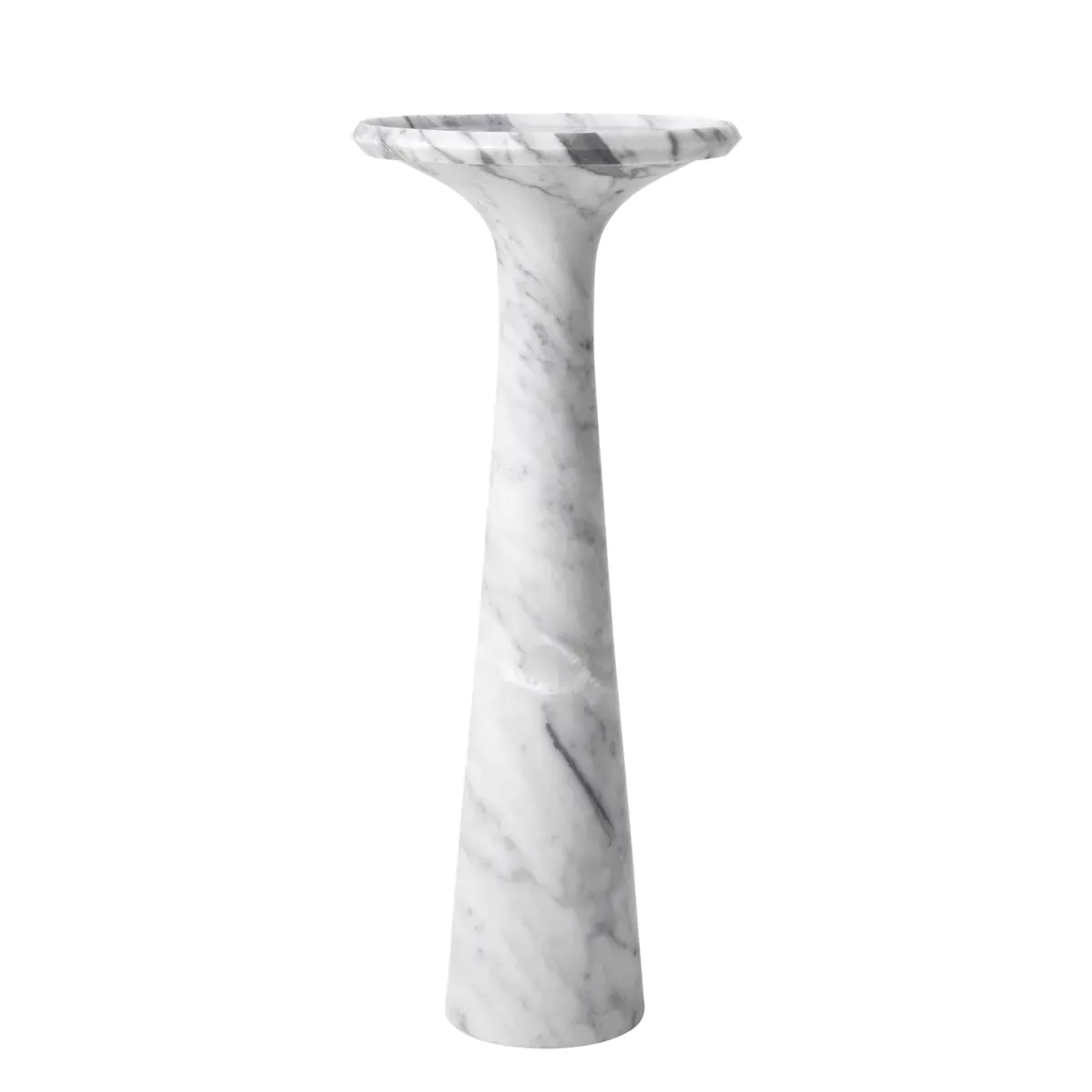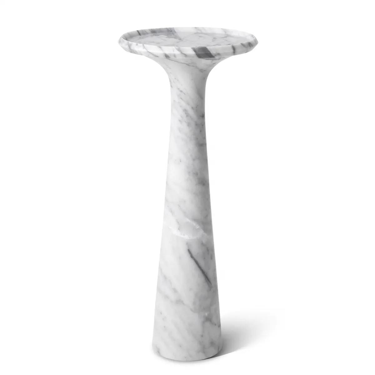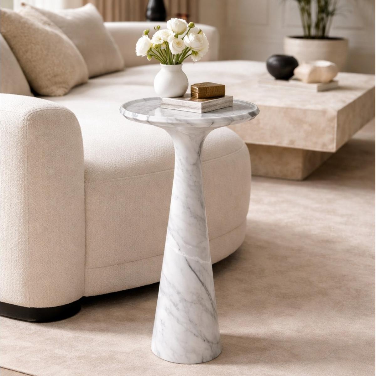 Der Luxuriöse Skulpturale Sockel-Beistelltisch aus Weißem Marmor für das Wohnzimmer ist ein raffiniertes architektonisches Highlight, das anspruchsvolle Innenräume aufwertet. Fachmännisch aus massivem, geschliffenem italienischem Marmor gefertigt, verkörpert dieser Luxuriöse runde Beistelltisch mit weißer Marmorplatte skulpturale Eleganz durch seine schlanke Sockelform und ausgewogene Proportionen. Die runde Tischplatte verfügt über eine dezent erhöhte Kante, die sowohl die Praktikabilität als auch die optische Raffinesse erhöht. Die geschliffene Oberfläche mildert den leuchtend weißen Ton des Marmors, während die natürliche Maserung elegant zur Geltung kommt, wodurch jedes Stück vollkommen einzigartig bleibt. Sein hoher, ausgestellter Sockel schafft ein fließendes vertikales Profil, inspiriert vom modernistischen Design der Siebzigerjahre und neu interpretiert für zeitgenössische europäische Wohnzimmer.