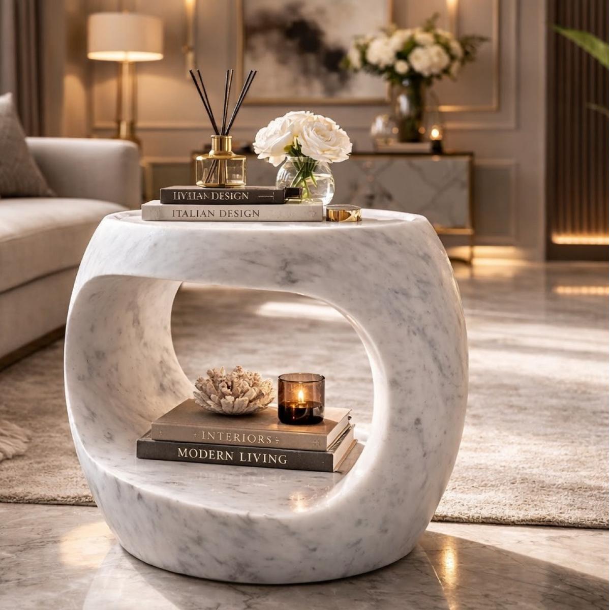 Dieser hochglanz polierte weiße Marmor Beistelltisch fügt sich mühelos in luxuriöse Residenzen und Boutique-Hospitality-Settings ein, die skulpturale Schlichtheit suchen. Seine massive Konstruktion gewährleistet dauerhafte Haltbarkeit, während seine organische Geometrie kuratierte Räume aufwertet.