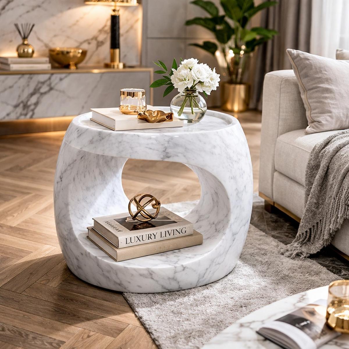 Luxuriöser skulpturaler weißer Marmor-Beistelltisch mit honierter Oberfläche und mittigem offenem Stauraum-Design von Luxury Group International