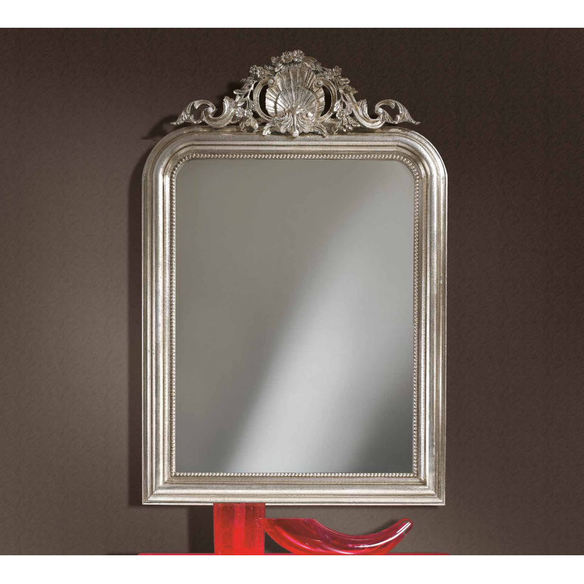 Luxus silberner Barock-Wandspiegel mit verschnörkelter Muschelkrone und abgerundeten Ecken mit perlenbesetztem Rahmen von Luxury Group International