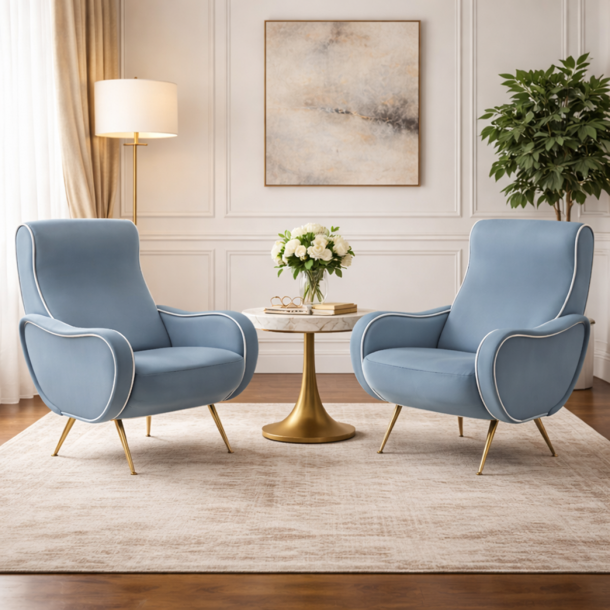Um eine ausgefeilte Innenraumkomposition zu vervollständigen, positionieren Sie diesen Sessel neben eleganten , luxuriösen Beistelltischen in Marmor-, Messing- oder dunklem Holzdekor. Die himmelblaue Polsterung passt sowohl zu neutralen Paletten als auch zu mehrschichtigen dekorativen Akzenten und bietet Vielseitigkeit in modernen europäischen Einrichtungskonzepten. Ob als Akzent oder paarweise arrangiert, bietet er dauerhaften Komfort und zeitlose Raffinesse.