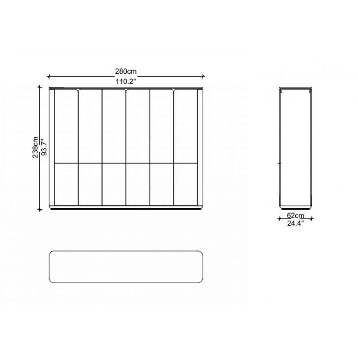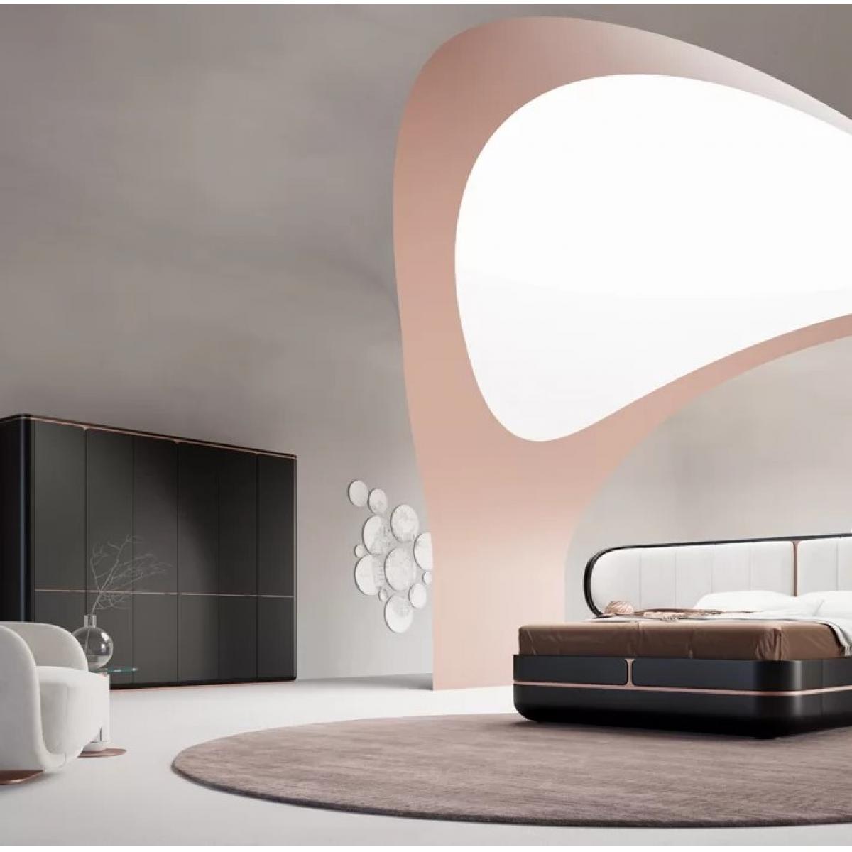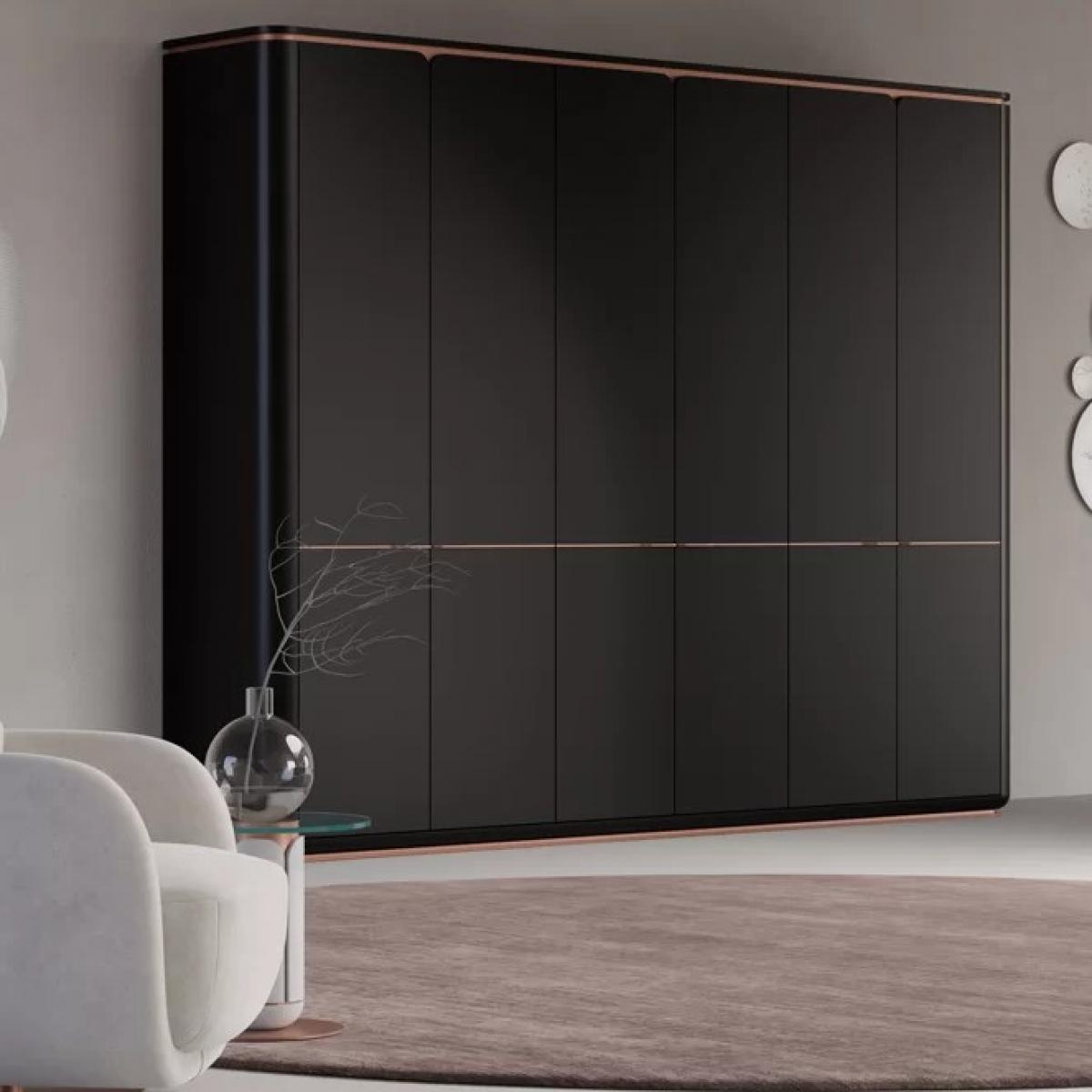 Entwickelt für moderne minimalistische Innenräume, verbindet dieser Luxus Schlafzimmer-Schrank ruhige, matte schwarze Oberflächen mit feinen kupferfarbenen Kontrasten. Die Front wird durch sechs vertikal unterteilte Paneelsegmente definiert, getrennt durch schmale, zurückgesetzte Linien, die einen klaren visuellen Rhythmus schaffen. Abgerundete äußere Ecken und ein schmaler Rahmen um die Peripherie mildern die Silhouette, während der Gesamteindruck architektonisch und präzise bleibt. Ohne sichtbare Frontbeschläge behält der Schrank eine saubere, aufgeräumte Front – ideal für Schlafzimmer und Gästezimmer, in denen Stil und Ordnung zählen. Ein dünner horizontaler Akzentstreifen verläuft mittig über die Türfläche und setzt eine subtile Blicklinie, die die vertikale Geometrie aufbricht und das Design aufwertet.