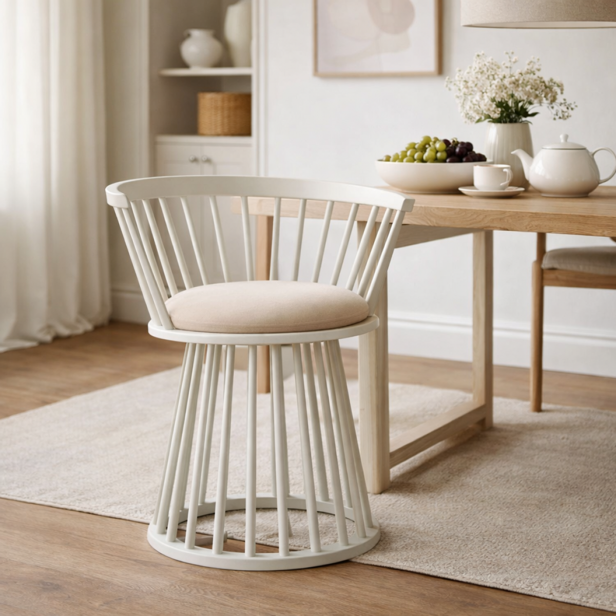 Luxuriöser Spindelrahmen Polsterstuhl mit Sockelkäfigbasis und Gepolstertem Sitz ist eine kühne Interpretation des modernen europäischen Designs. Dieser luxuriöse gepolsterte Esszimmerstuhl verfügt über eine elegant geschwungene Spindelrückenlehne, die sich nach außen in eine markante Sockelkäfigbasis ausdehnt und so eine skulpturale Silhouette schafft, die Aufmerksamkeit erregt. Der großzügig gepolsterte cremefarbene Sitz mildert die architektonische Struktur ab und bietet sowohl visuelles Gleichgewicht als auch Sitzkomfort. Entworfen als ein Statement-luxuriöser Esszimmerstuhl, verbindet er zeitgenössische Kunstfertigkeit mit funktionaler Raffinesse.