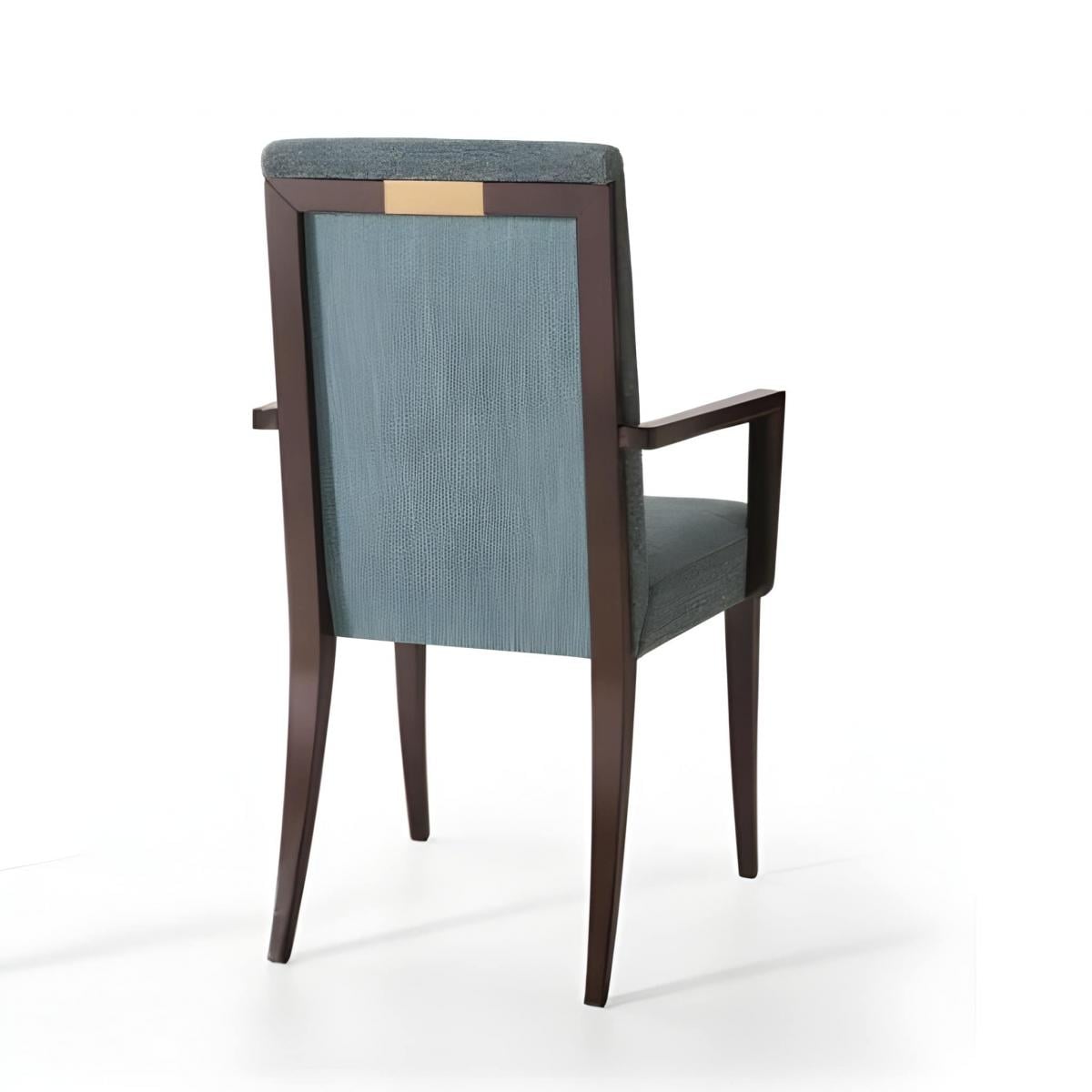 Luxury Textured Upholstered Dining Armchair in Ocean Mist Blue mit Gestell aus dunklem Walnussholz verkörpert handwerkliche Präzision und zeitgenössische europäische Raffinesse. Dieser luxuriöse gepolsterte Esszimmerstuhl zeichnet sich durch eine schlanke Hochlehner-Silhouette mit einem kompakten, stützenden Sitzprofil aus, das für optische Leichtigkeit sorgt, ohne den Komfort zu beeinträchtigen. Der Stuhl ist mit einem reich strukturierten Ocean Mist-Stoff gepolstert und wird von einem Gestell aus dunklem Walnussholz mit klaren, geradlinigen Armlehnen und subtil verjüngten Beinen umrahmt. Ein dezenter Messingakzent an der Rückseite unterstreicht seinen architektonischen Charakter und macht ihn zu einem Statement in eleganten Esszimmern.