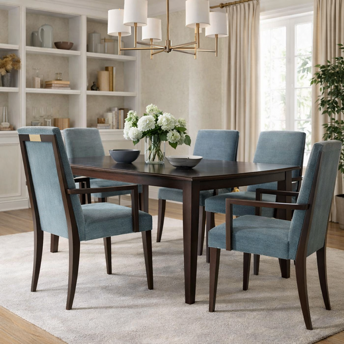 Innerhalb unserer kuratierten Kollektion von Luxus-Esszimmerstühlen bietet dieser Sessel den zusätzlichen Vorteil von stützenden Armlehnen, die im Vergleich zu armlosen Alternativen mehr Komfort bieten. Für diejenigen, die ein schlankeres Profil ohne Armlehnen bevorzugen, bietet der Luxury Textured Upholstered Dining Chair in Ocean Teal mit dunklen Walnussholzbeinen eine ergänzende Option. Zusammen ermöglichen diese Designs eine ausgewogene Esszimmerkomposition, die Struktur, Komfort und zeitgenössische Eleganz miteinander verbindet.