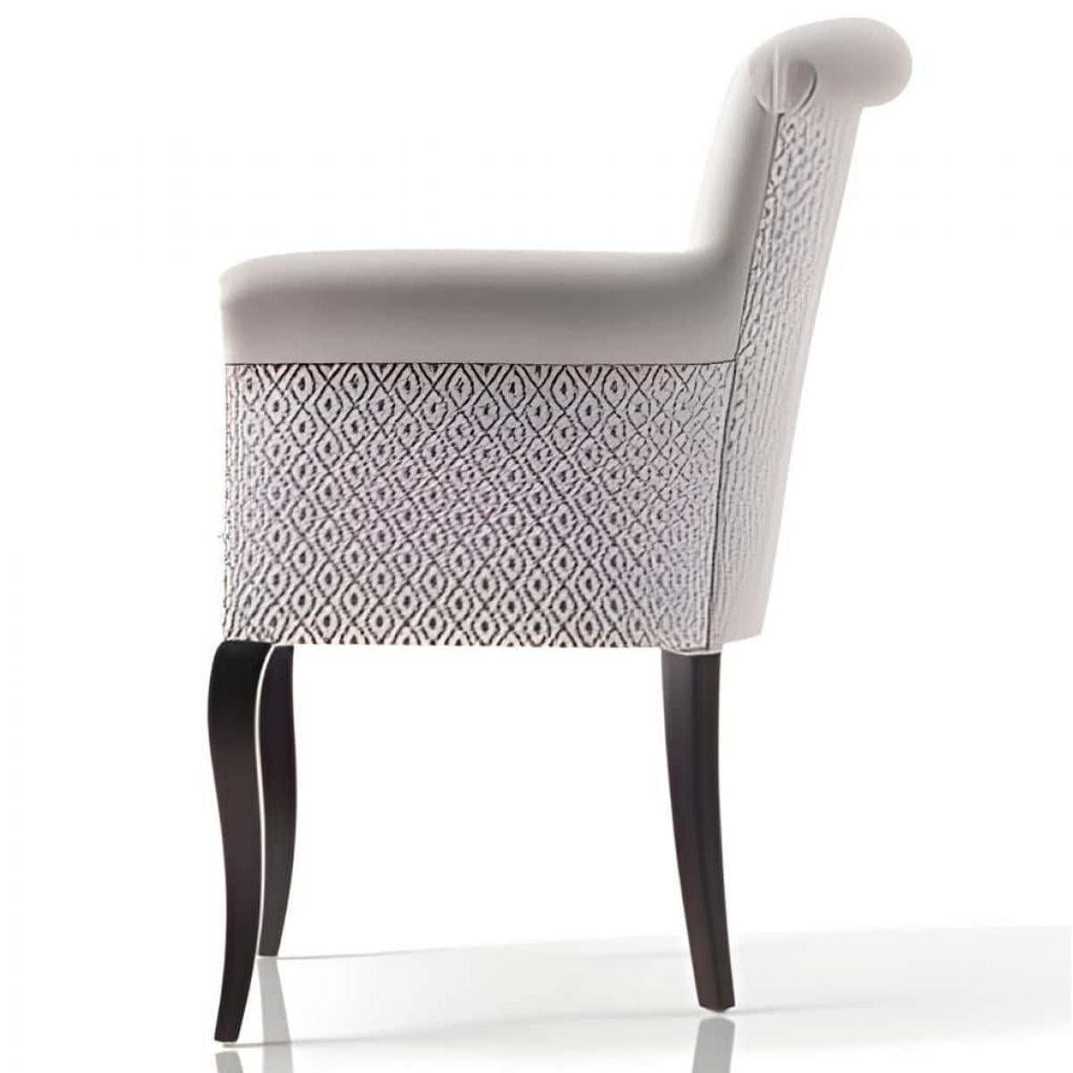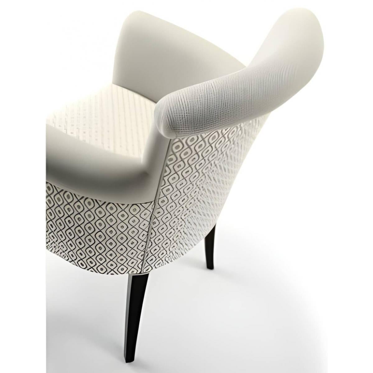 Ein raffinierter, luxuriös gepolsterter Esszimmer-Sessel aus weichem, elfenbeinfarbenem Stoff mit eleganten, gemusterten Seitenteilen und Beinen aus dunklem Walnussholz. Dieses Stück wurde entwickelt, um anspruchsvolle Luxus-Sessel für Wohnzimmer-Interieurs aufzuwerten und spiegelt die kuratierte europäische Exzellenz der Luxury Group International (LGI) wider.