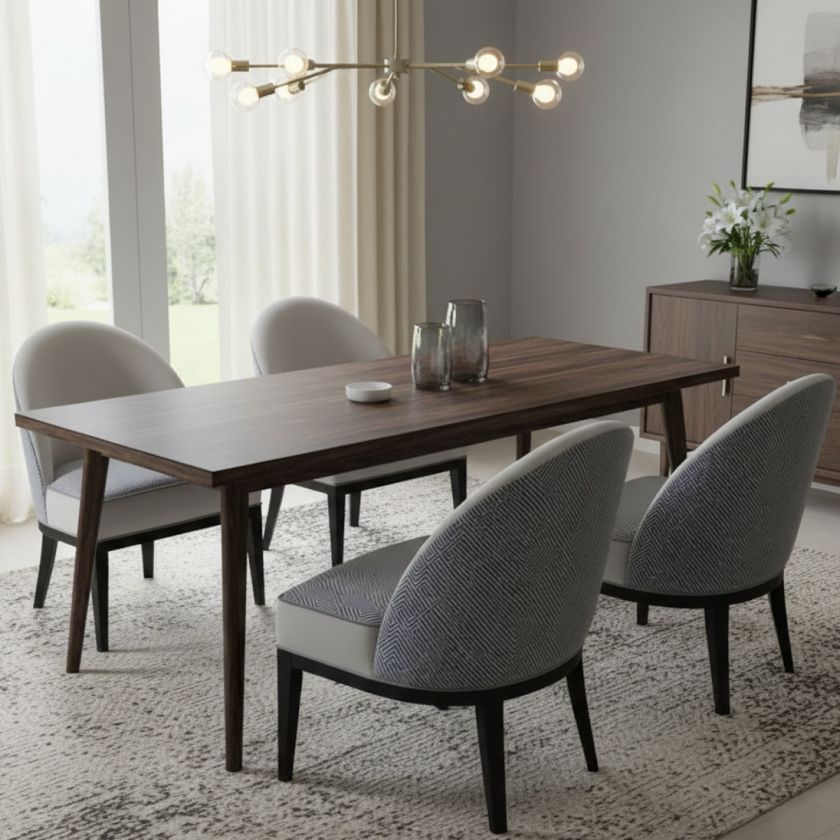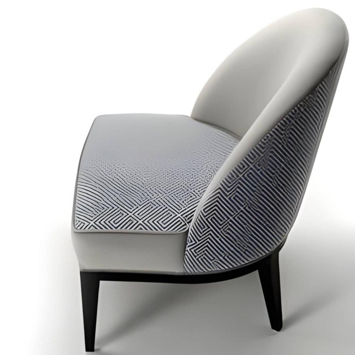 Unter den angesehenen Kollektionen von Luxus-Esszimmerstühlen stellt dieses Modell ein harmonisches Gleichgewicht zwischen Minimalismus und dekorativen Details dar. Die klare Innensilhouette kontrastiert wunderschön mit der gemusterten Außenverkleidung und schafft eine unaufdringliche, aber unvergessliche Präsenz in gepflegten Esszimmern. Für eine wärmere Farbalternative mit champagnerfarbenen Akzenten bietet der Luxus-Polster-Esszimmerstuhl in Taupe-Stoff mit geometrisch geschwungener, gemusterter Rückenlehne und sich verjüngenden champagnerfarbenen Holzbeinen eine raffinierte Variante, wobei das gleiche Engagement für Handwerkskunst und architektonische Klarheit erhalten bleibt.