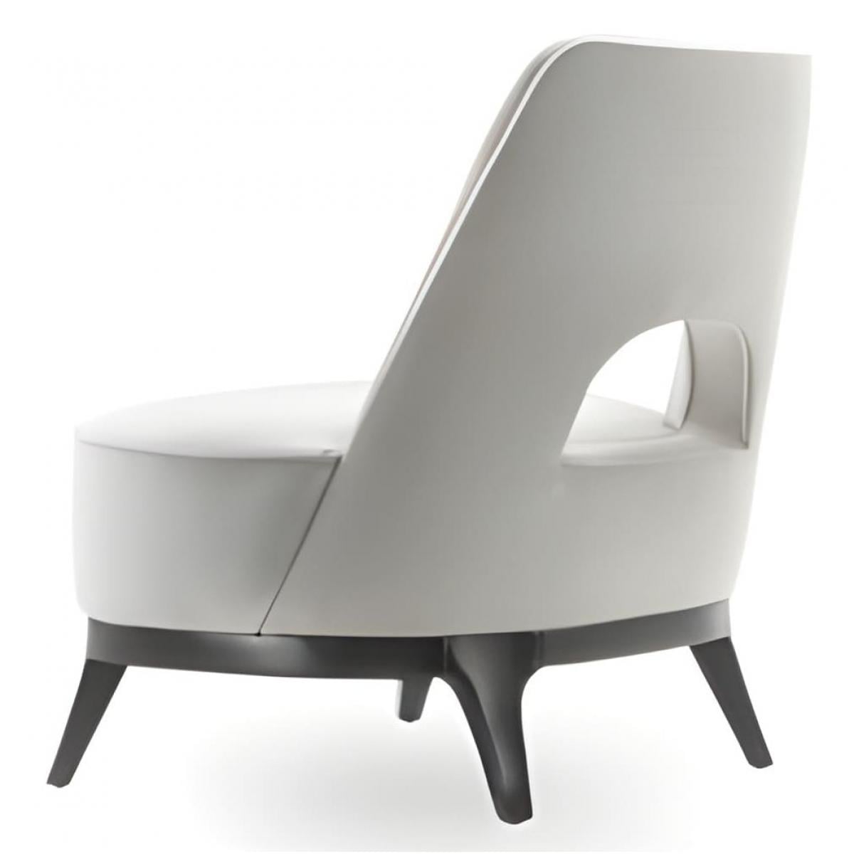 Ein raffinierter, luxuriöser, gepolsterter Loungesessel in Perlweiß mit einem markanten Rückenausschnitt und einem Untergestell aus schwarzem Nussbaumholz. Dieses elegante Stück von Luxury Group International (LGI) wurde für erstklassige Residenzen und Luxusstühle für Hotelinterieurs entworfen und verbindet architektonische Form mit überlegenem Komfort und zeitgenössischer europäischer Raffinesse.