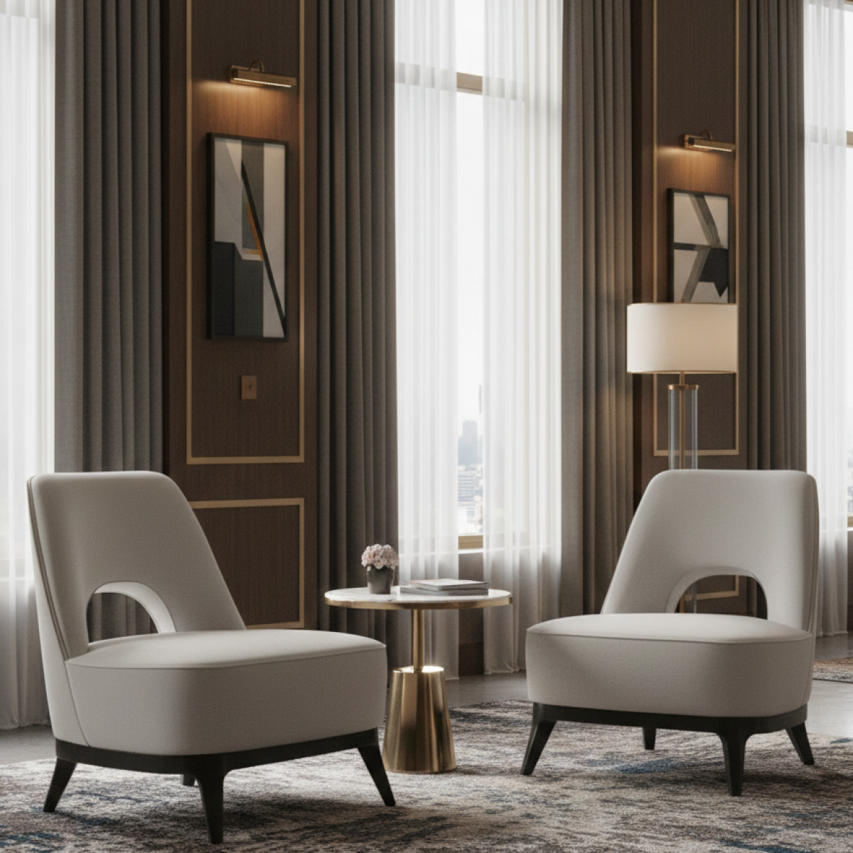 Der Luxury Upholstered Lounge Chair in Perlweiß mit skulpturaler Rückenöffnung und Untergestell aus schwarzem Nussbaum verkörpert unaufdringliche Eleganz und moderne europäische Raffinesse. Als luxuriöser gepolsterter Loungesessel mit Statement-Charakter zeichnet er sich durch eine glatte perlweiße Außenschale aus, die durch eine sorgfältig konturierte Rückenöffnung ergänzt wird, die die visuelle Tiefe verstärkt und gleichzeitig die strukturelle Harmonie aufrechterhält. Die großzügig gepolsterte Sitzfläche sorgt für einladenden Komfort, während das Untergestell aus massivem schwarzem Nussbaum Wärme und Kontrast bietet. Dank seiner ausgewogenen Proportionen eignet er sich gleichermaßen für private Wohnräume und gehobene Gastlichkeitsbereiche.