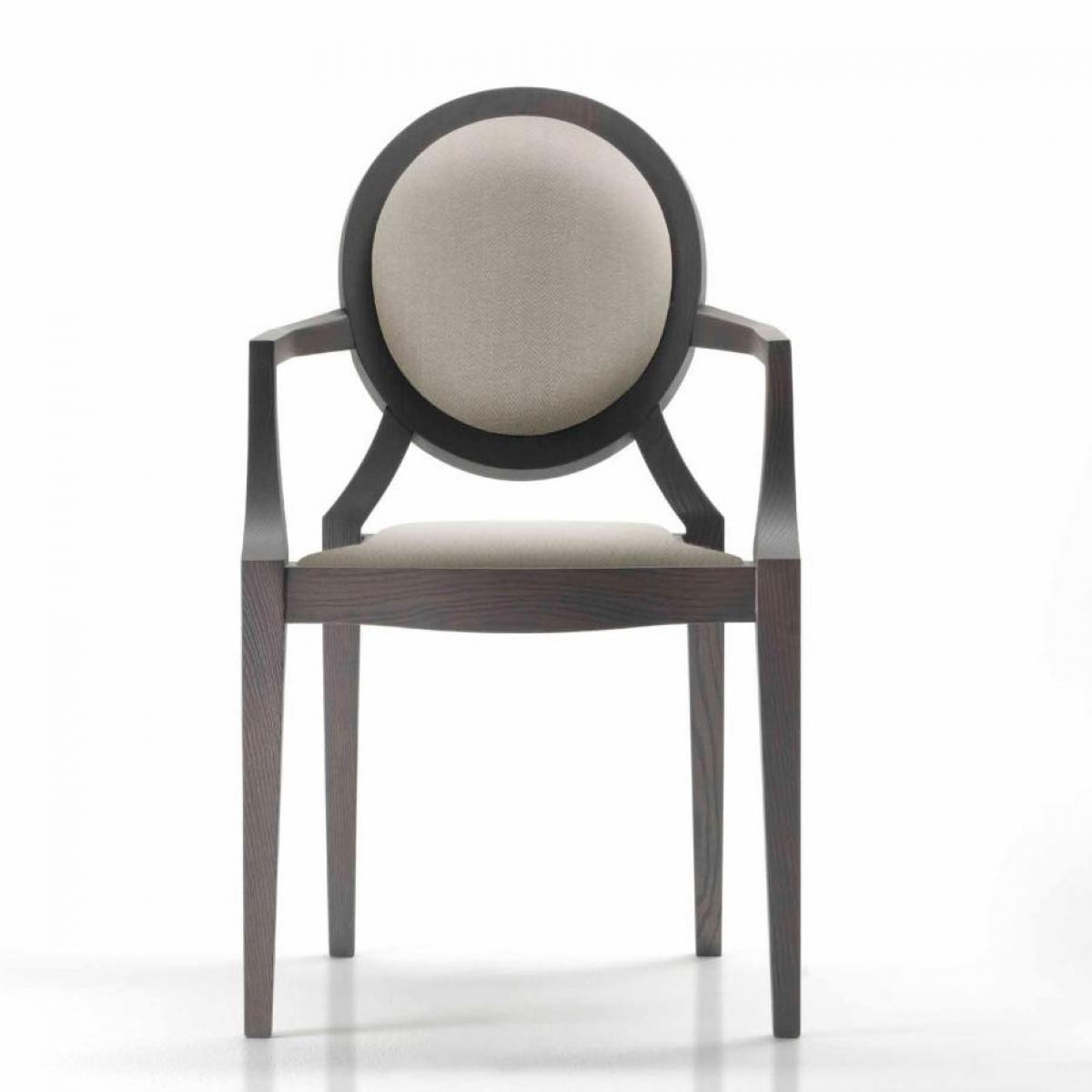 Dieser luxuriöse, gepolsterte Esszimmerstuhl mit seiner auffälligen Medaillon-Rückenlehne und dem Gestell aus dunklem Eschenholz ist die ideale Ergänzung zu den luxuriösen Sesseln für Esszimmer mit zeitloser europäischer Eleganz und hohem Komfort.