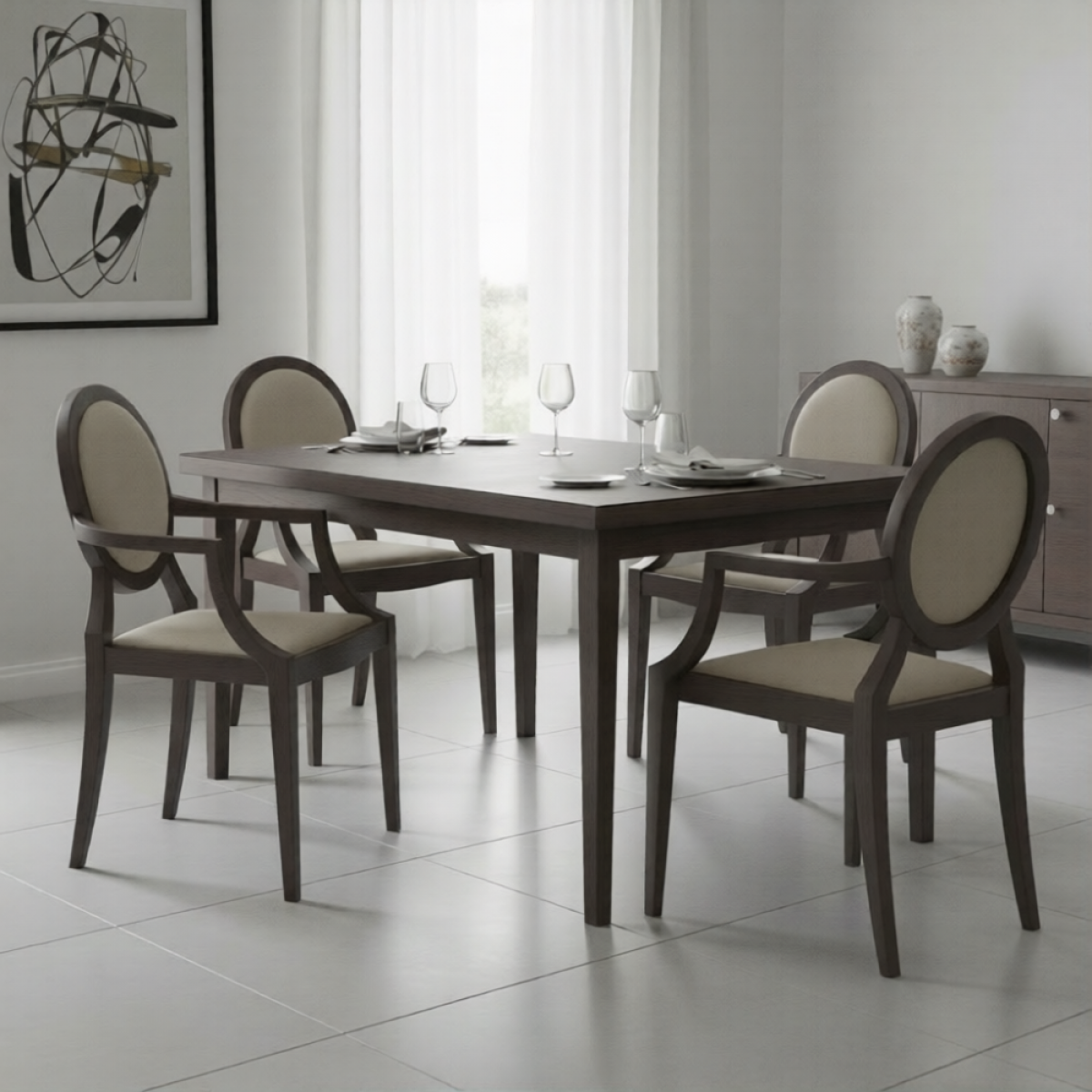 Dieses Stück ist eine ideale Ergänzung für Ihre Kollektion von Luxussesseln für das Esszimmer und bietet nicht nur Komfort, sondern auch einen visuellen Schwerpunkt. Die Medaillon-Rückenlehne mit ihren klassischen Details verleiht dem Stuhl ein Gefühl von Zeitlosigkeit, während die tiefen Farbtöne des dunklen Eschenholzes eine raffinierte Grundlage bilden. Als ergänzende Alternative bietet sich der Luxury Upholstered Dining Chair in Beige und gemustertem Stoff mit geschwungener Rückenlehne und Holzgestell an, der eine einzigartige Mischung aus neutralen Tönen und subtiler Textur bietet und eine nahtlose Variation innerhalb Ihrer Esszimmerkollektion ermöglicht.