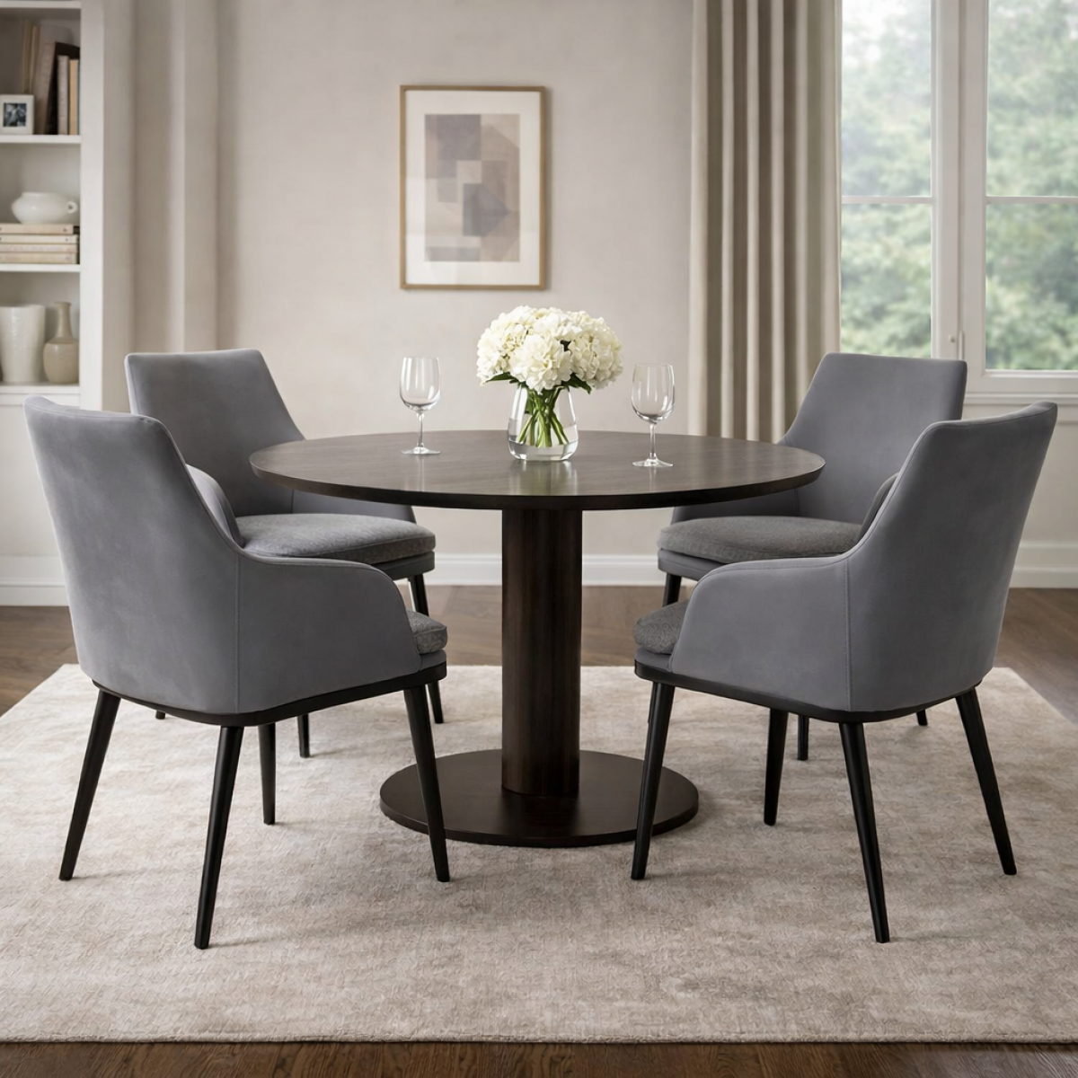 Luxuriöser gepolsterter Esstischsessel mit geflügelter Rückenlehne in Eschengrau und schwarzen, spitz zulaufenden Beinen drückt moderne europäische Eleganz durch raffinierte Form und durchdachte Proportionen aus. Dieser luxuriöse gepolsterte Esstischsessel verfügt über eine anmutig geschwungene, geflügelte Rückenlehne, die den Sitzenden sanft umarmt und sowohl visuelle Präsenz als auch ergonomische Unterstützung bietet. Die aschgraue Polsterung verleiht einen ruhigen, raffinierten Ton, während der großzügig gepolsterte Sitz Komfort bei ausgedehnten Essensgelegenheiten gewährleistet. Abgeschlossen mit schwarzen, spitz zulaufenden Beinen erreicht das Design strukturelle Klarheit und einen dezenten Kontrast, der zu raffinierten Interieurs passt.