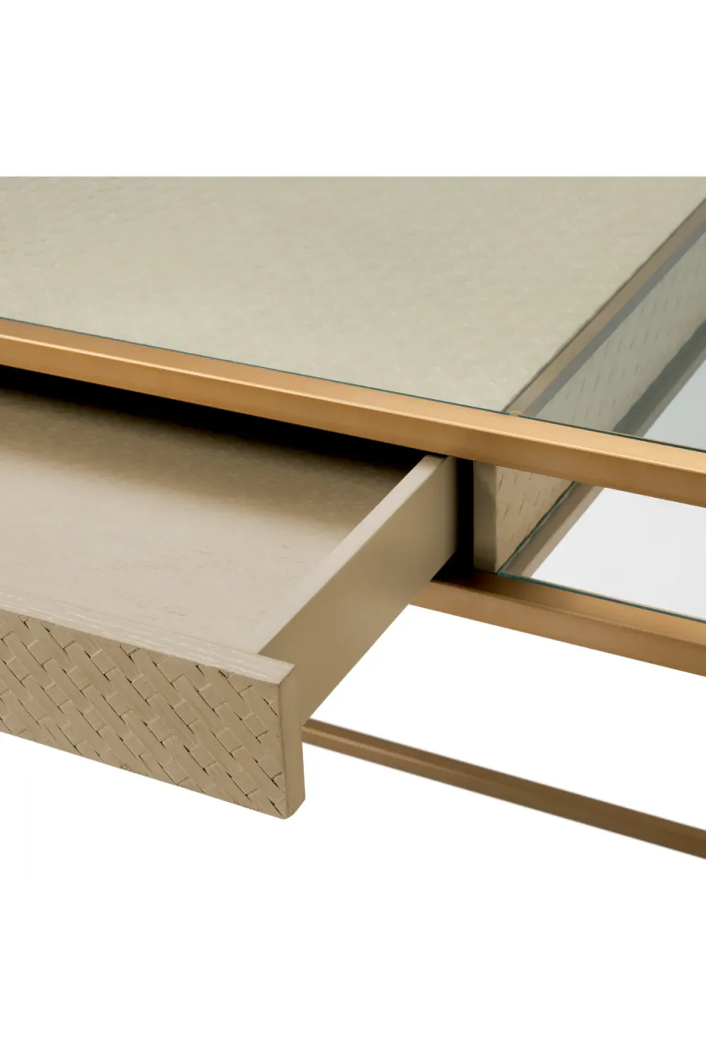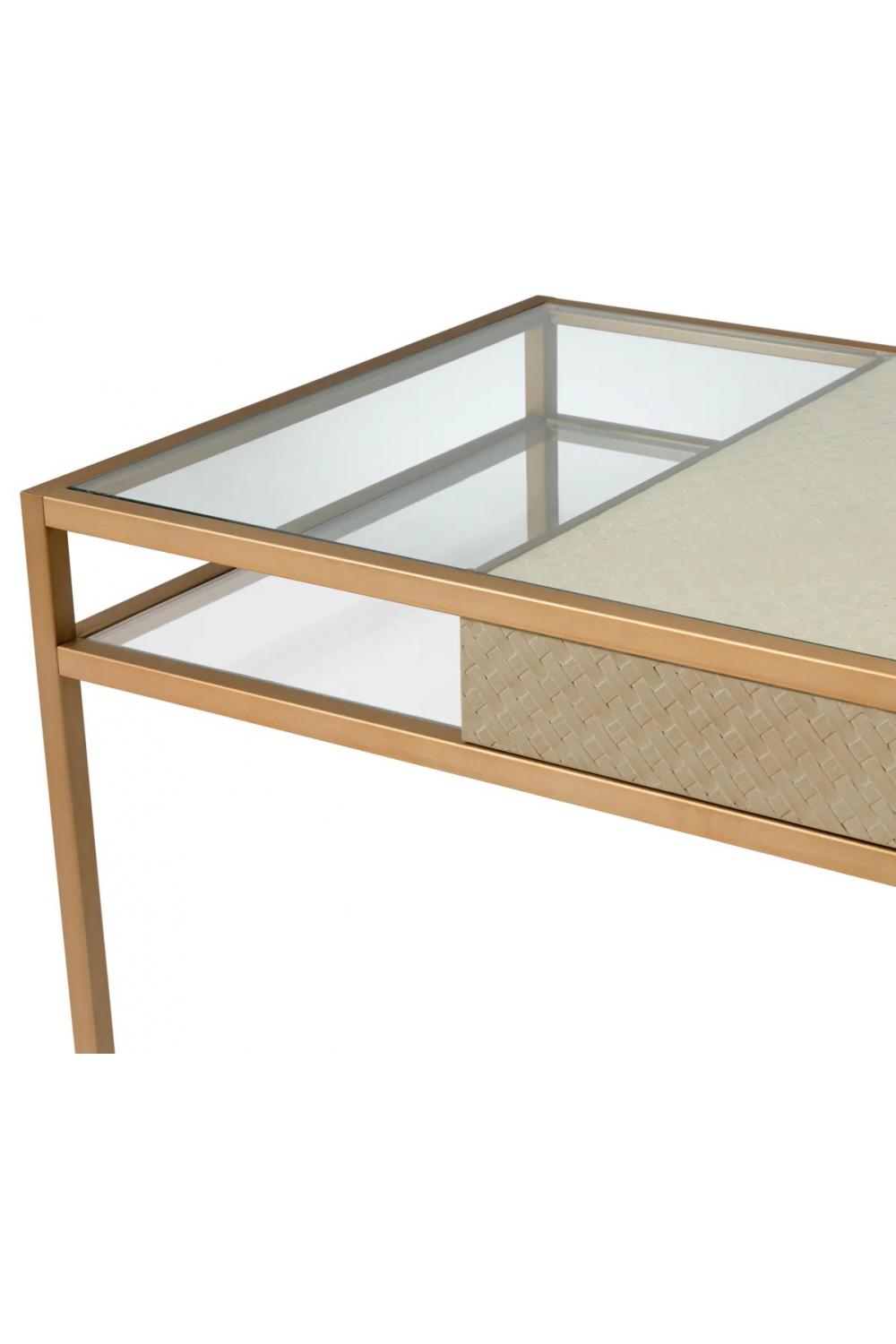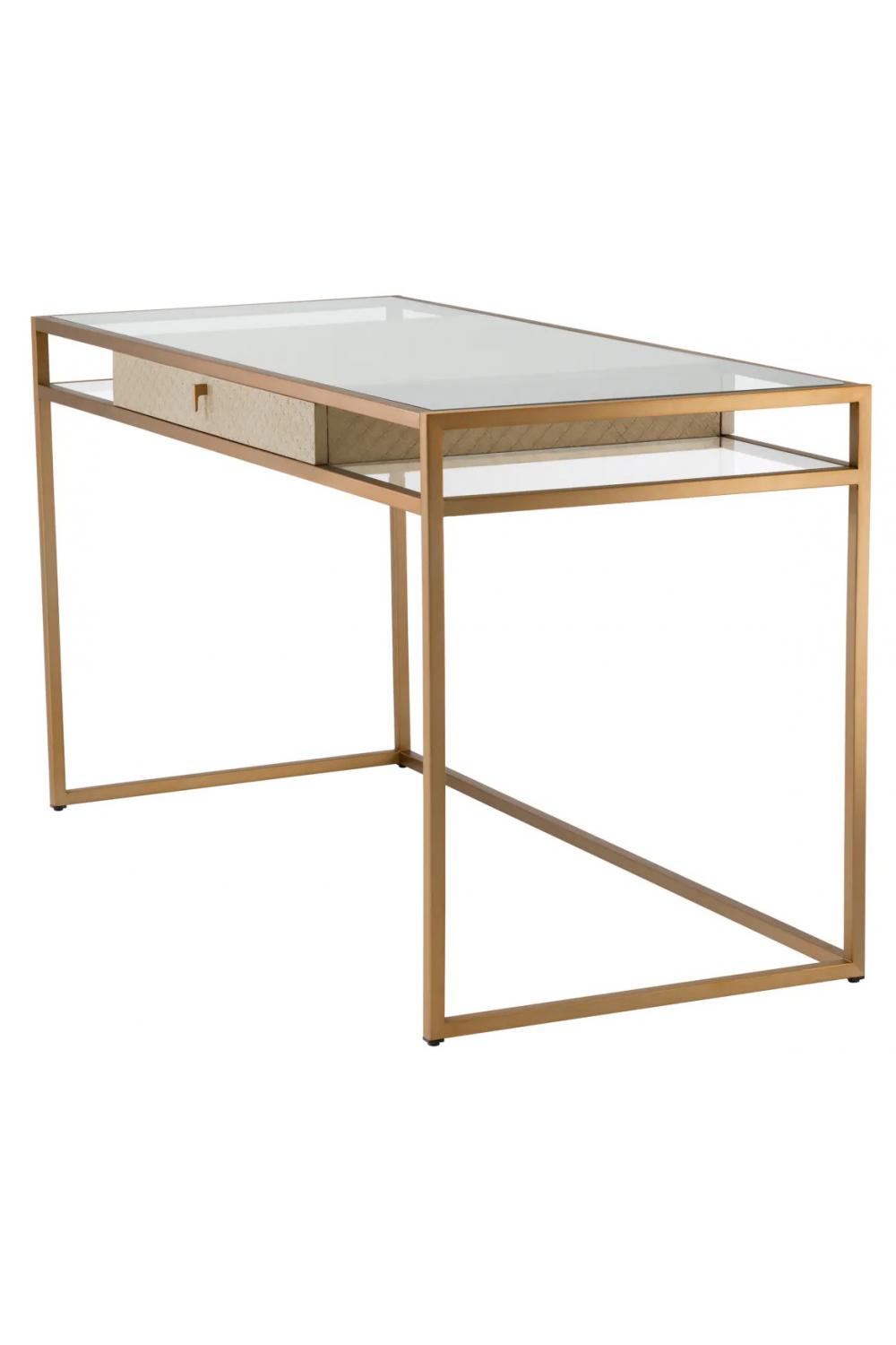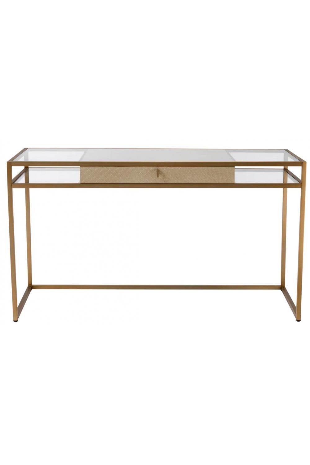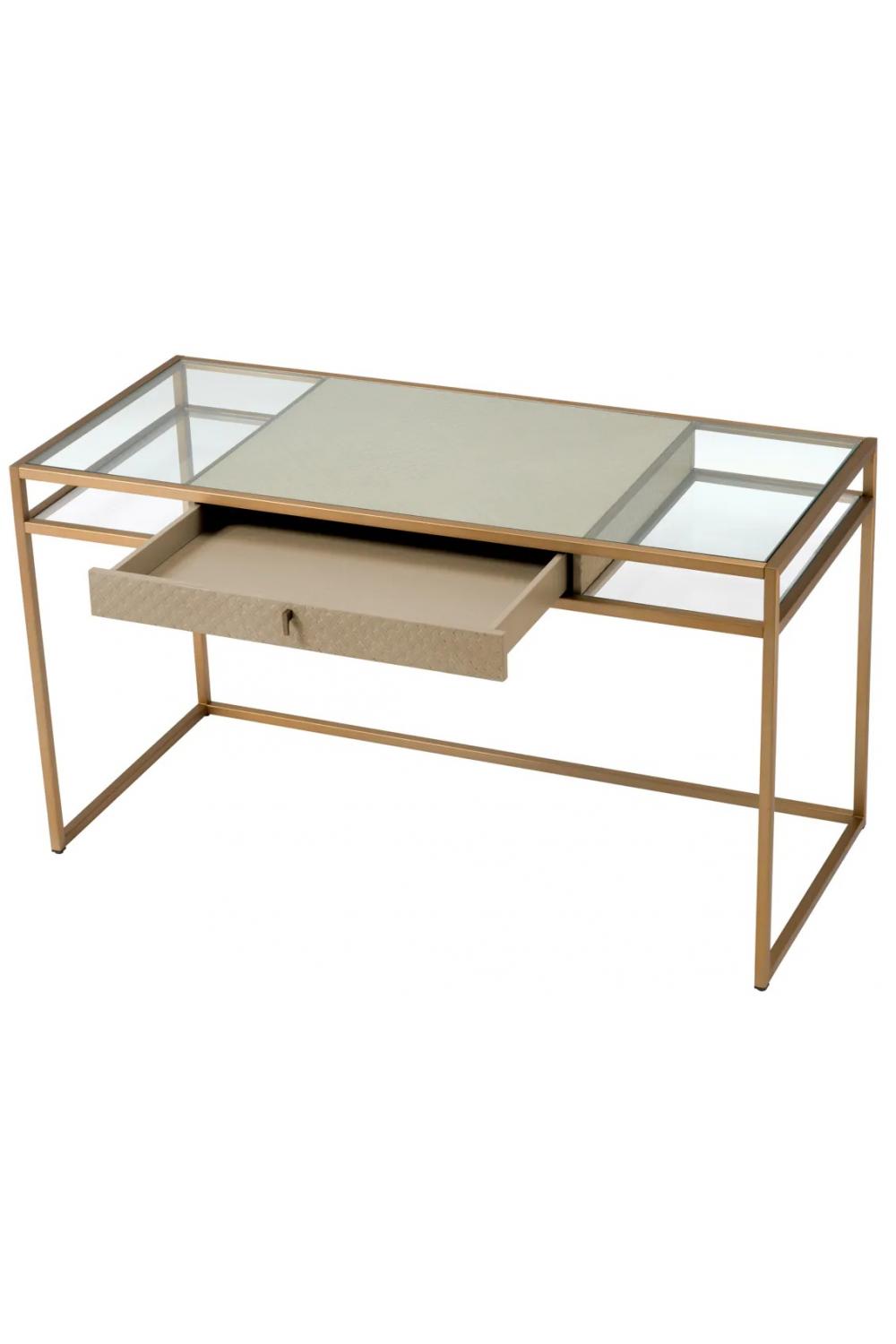 Ein edler Luxusschreibtisch, gefertigt für elegante Innenräume, entworfen als Glastisch mit einem robusten Messingrahmen für ein modernes, elegantes Erscheinungsbild. Dieser vielseitige Luxusschreibtisch verbindet Funktionalität und Raffinesse für zeitgemäße Arbeitsbereiche.