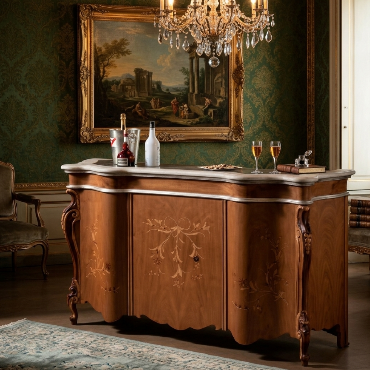 Um ein kohärentes und visuell ausgewogenes Innenarrangement zu vervollständigen, verstärkt die Kombination dieses Schranks mit luxuriösen Barockspiegeln die Raffinesse des umgebenden Raums. Ein schön gerahmter Spiegel, der über dem Sideboard platziert wird, reflektiert das Licht und betont die eleganten Proportionen des Schranks, während er der Raumdekoration Tiefe verleiht. Die Kombination aus skulpturaler Holzarbeit, dekorativen Intarsien und reflektierenden Oberflächen schafft einen raffinierten Blickfang, ideal für Esszimmer, Wohnzimmer oder Eingangshallen. Dadurch wird dieser Schrank zu einem herausragenden Beispiel für Luxus-Sideboards für Wohnzimmer Innenräume, in denen Handwerkskunst, Eleganz und Funktionalität nahtlos zusammenkommen.
