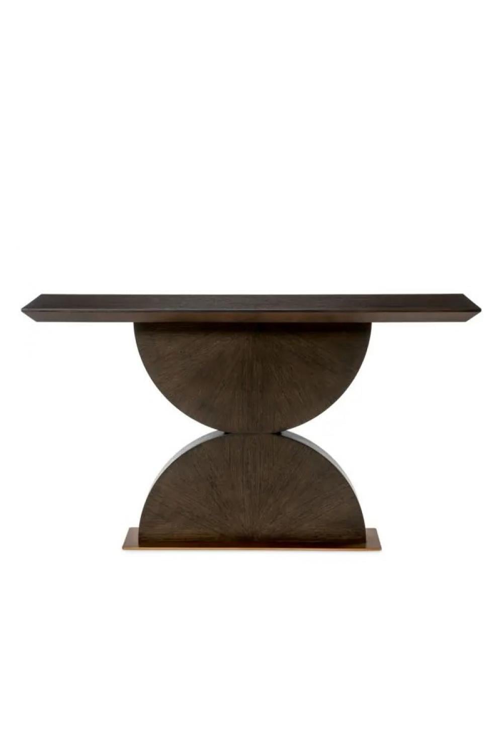 Der luxuriöse Konsolentisch aus Holz mit Sanduhrform ist eine raffinierte Interpretation des modernen europäischen Designs, das sich durch seinen skulpturalen Sockel und seine raffinierten Proportionen auszeichnet. Dieser Konsolentisch aus mokkafarbenem Eichenfurnier zeichnet sich durch eine elegante Sanduhrsilhouette aus, die durch Details aus gebürstetem Messing akzentuiert wird. Das Zusammenspiel von warmen Holztönen und subtilen metallischen Highlights schafft eine ausgewogene, zeitgenössische Ästhetik mit zeitlosem Reiz.