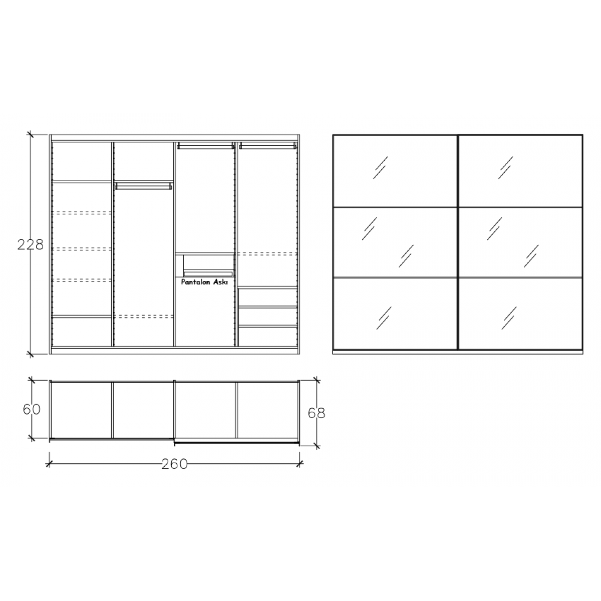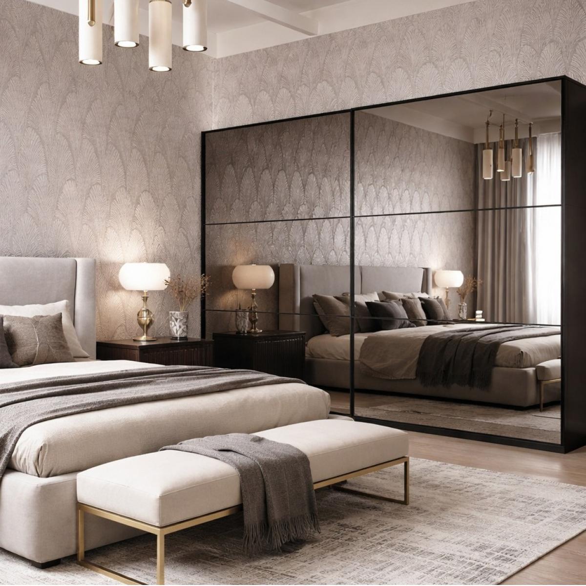 Als Luxus Schlafzimmer Schrank ist er dafür gemacht, tägliche Essentials aufzubewahren und dabei dennoch sauber und organisiert zu wirken. Die Front aus Spiegelglas erweitert optisch den Raum und sorgt für mehr Licht, was den Schrank praktisch für tägliche Ankleideroutinen macht. Das schlanke Frontdesign lenkt die Aufmerksamkeit auf den Spiegel und die architektonische Symmetrie der Anordnung.
