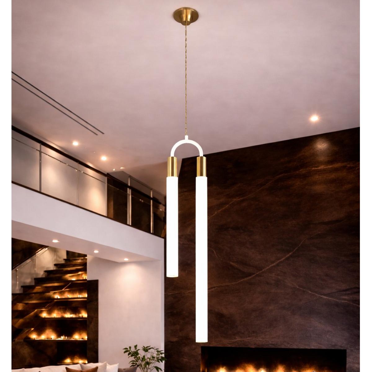Durchdachte Konstruktion sorgt für ein ausgewogenes visuelles Gleichgewicht: Eine kleine, runde Deckenrosette in Gold verankert die Aufhängung, während ein einzelner zentraler Draht/Stab die Komposition zentriert und ordentlich hält. Jede Röhre ist mit goldfarbenen Beschlägen versehen, die die Hardware dezent um die mattierten Diffusoren rahmen. Die beiden Röhren hängen in unterschiedlichen Längen, was eine geschmackvolle Asymmetrie erzeugt, ohne die schlanke Optik zu stören – eine perfekte Wahl für alle, die eine luxus Deckenleuchte suchen, die elegant und zurückhaltend wirkt.