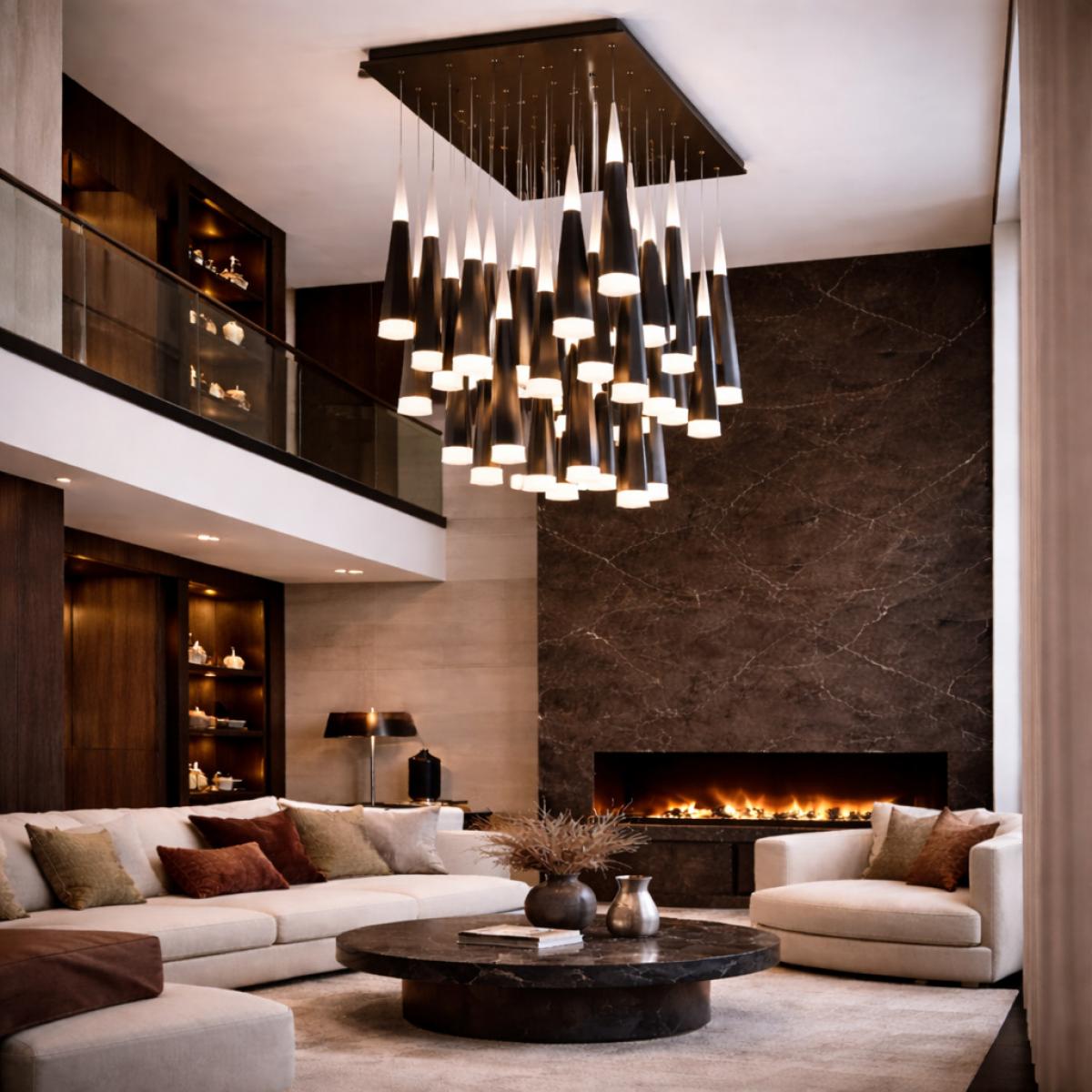 Setzen Sie mit diesem modernen LED-Pendelleuchter Luxus Kronleuchter aus dunkelbraunem Acryl einen architektonischen Akzent an Ihrer Decke, der durch klare Linien besticht und dabei nicht überladen wirkt. Im Zentrum steht ein trapezförmiges Baldachin, das eine Komposition aus schlanken, hängenden Stäben in mattem Dunkelbraun-Schwarz rahmt. Darunter hängen rechteckige, transluzente Schirme in einer gestaffelten Anordnung, die Tiefe erzeugt und gleichzeitig die klare, präzise Silhouette bewahrt. Das Licht, das durch den mattierten Diffusor fällt, wirkt weich und dennoch definiert – perfekt für die stilvolle Beleuchtung von Essbereichen, Lounges oder Eingangsbereichen, in denen eine eindrucksvolle Atmosphäre gewünscht ist. Dieses Design moderner Kronleuchter überzeugt aus jedem Blickwinkel: strukturiert oben, wunderschön dimensional unten und stets harmonisch komponiert.