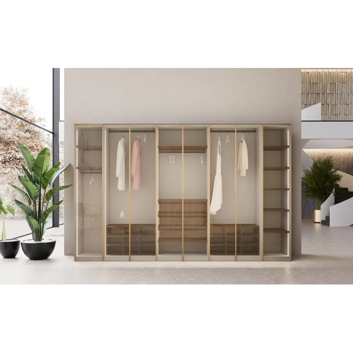 Mit Blick auf Vielseitigkeit dient das Produkt sowohl als praktisches Aufbewahrungsmöbel als auch als schöner Vitrinenschrank. Die Glastürpaneele verbessern die Sichtbarkeit, sodass Sie Ihre Sammlungen oder ordentlich arrangierte Gegenstände mühelos präsentieren können. Die warmen Holztöne im Inneren kontrastieren elegant mit der schlanken Glasaußenfläche und schaffen eine harmonische Materialbalance. Dieser Glasvitrinenschrank fügt sich nahtlos in moderne Innenräume ein und verleiht ihnen einen Hauch von Luxus und Raffinesse. Sein Aufbau unterstützt eine organisierte Aufbewahrung und macht ihn perfekt für Schlafzimmer, Ankleidezimmer oder gehobene Wohnbereiche.